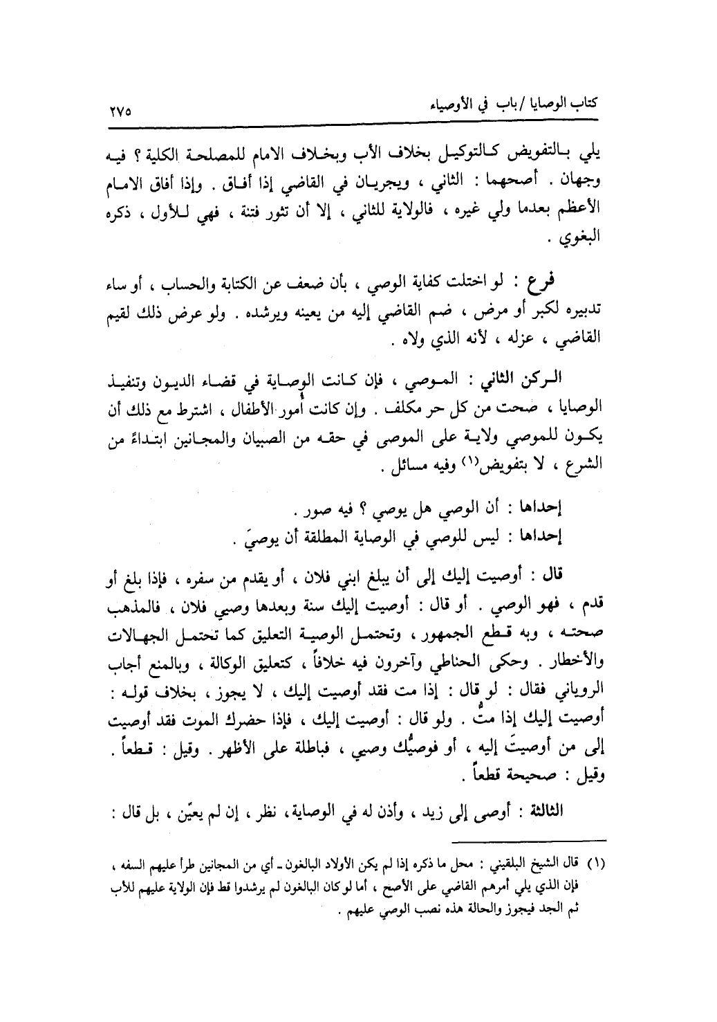 الركن الثاني : الموصي، فإن كانت الوصاية في قضاء الديون وتنفيذ الوصايا، صحت من كل حر مكلف. وإن كانت في أمور الاطفال، اشترط مع ذلك أن يكون للموصي ولاية على الموصى في حقه من الصبيان والمجانين ابتداء من الشرع، لا بتفويض، وفيه مسائل. إحداها: أن الوصي هل يوصي ؟ فيه صور. إحداها: ليس للموصي في الوصاية المطلقة أن يوصي. الثانية: قال: أوصيت إليك إلى أن يبلغ ابني فلان، أو يقدم من سفره، فإذا بلغ أو قدم، فهو الوصي. أو قال: أوصيت إليك سنة وبعدها وصيي فلان، فالمذهب صحته، وبه قطع الجمهور، وتحتمل الوصية التعليق كما تحتمل الجهالات والاخطار. وحكى الحناطي وآخرون فيه خلافا كتعليق الوكالة، وبالمنع أجاب الروياني فقال: لو قال: إذا مت فقد أوصيت إليك، لا يجوز، بخلاف قوله: أوصيت إليك إذا مت. ولو قال: أوصيت إليك، فإذا حضرك الموت فقد أوصيت إلى من أوصيت إليه، أو فوصيك وصيي، فباطلة على الاظهر. وقيل: قطعا. وقيل: صحيحة قطعا. الثالثة: أوصى إلى زيد، وأذن له في الوصاية، نظر، إن لم يعين، بل قال: