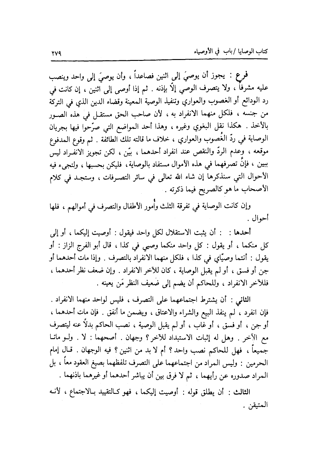 فرع يجوز أن يوصي إلى اثنين فصاعدا، وأن يوصي إلى واحد وينصب عليه مشرفا، ولا يتصرف الوصي إلا بإذنه. ثم إذا أوصى إلى اثنين، إن كانت في رد الودائع أو الغصوب والعواري وتنفيذ الوصية المعينة وقضاء الدين الذي في التركة من جنسه، فلكل منهما الانفراد به، لان صاحب الحق مستقل في هذه الصور بالاخذ. هكذا نقل البغوي وغيره، وهذا أحد المواضع التي صرحوا فيها بجريان الوصاية في رد الغصوب والعواري، خلاف ما قالته تلك الطائفة. ثم وقوع المدفوع موقعه، وعدم الرد والنقص عند انفراد أحدهما، بين، لكن تجويز الانفراد ليس ببين، فإن تصرفهما في هذه الاموال مستفاد بالوصاية، فليكن بحسبها، ولتجئ فيه الاحوال التي سنذكرها إن شاء الله تعالى في سائر التصرفات، وستجد في كلام الاصحاب ما هو كالصريح فيما ذكرتي. وإن كانت الوصاية في تفرقة الثلث وأمور الاطفال والتصرف في أموالهم، فلها أحوال. أحدها: أن يثبت الاستقلال لكل واحد فيقول: أوصيت إليكما، أو إلى كل منكما، أو يقول: كل واحد واحد منكما وصيي في كذا، قال أبو الفرج الزاز: أو يقول: أنتما وصياي في كذا، فلكل منهما الانفراد بالتصرف. وإذا مات أحدهما أو جن أو فسق، أو لم يقبل الوصاية، كان للآخر الانفراد. وإن ضعف نظر أحدهما، فللآخر الانفراد، وللحاكم أن يضم إلى ضعيف النظر من يعينه. الثاني: أن يشترط اجتماعهما على التصرف، فليس لواحد منهما الانفراد. فإن انفرد، لم ينفذ البيع والشذاء والاعتاق، ويضمن ما أنفق. فإن مات أحدهما، أو جن، أو فسق، أو غاب، أو لم يقبل الوصية، نصب الحاكم بدلا عنه ليتصرف مع الآخر. وهل له إثبات الاستبداد للآخر ؟ وجهان. أصحهما: له. ولو ماتا جميعا، فهل للحاكم نصب واحد ؟ أم لا بد من اثنين ؟ فيه الوجهان. قال إمام الحرمين: وليس المراد من اجتماعهما على التصرف تلفظهما بصيغ العقود معا، بل المراد صدوره عن رأيهما، ثم لا فرق بين أن يباشر أحدهما أو غيرهما بإذنهما. الثالث: أن يطلق قوله: أوصيت إليكما، فهو كالتقييد بالاجتماع، لانه المتيقن.