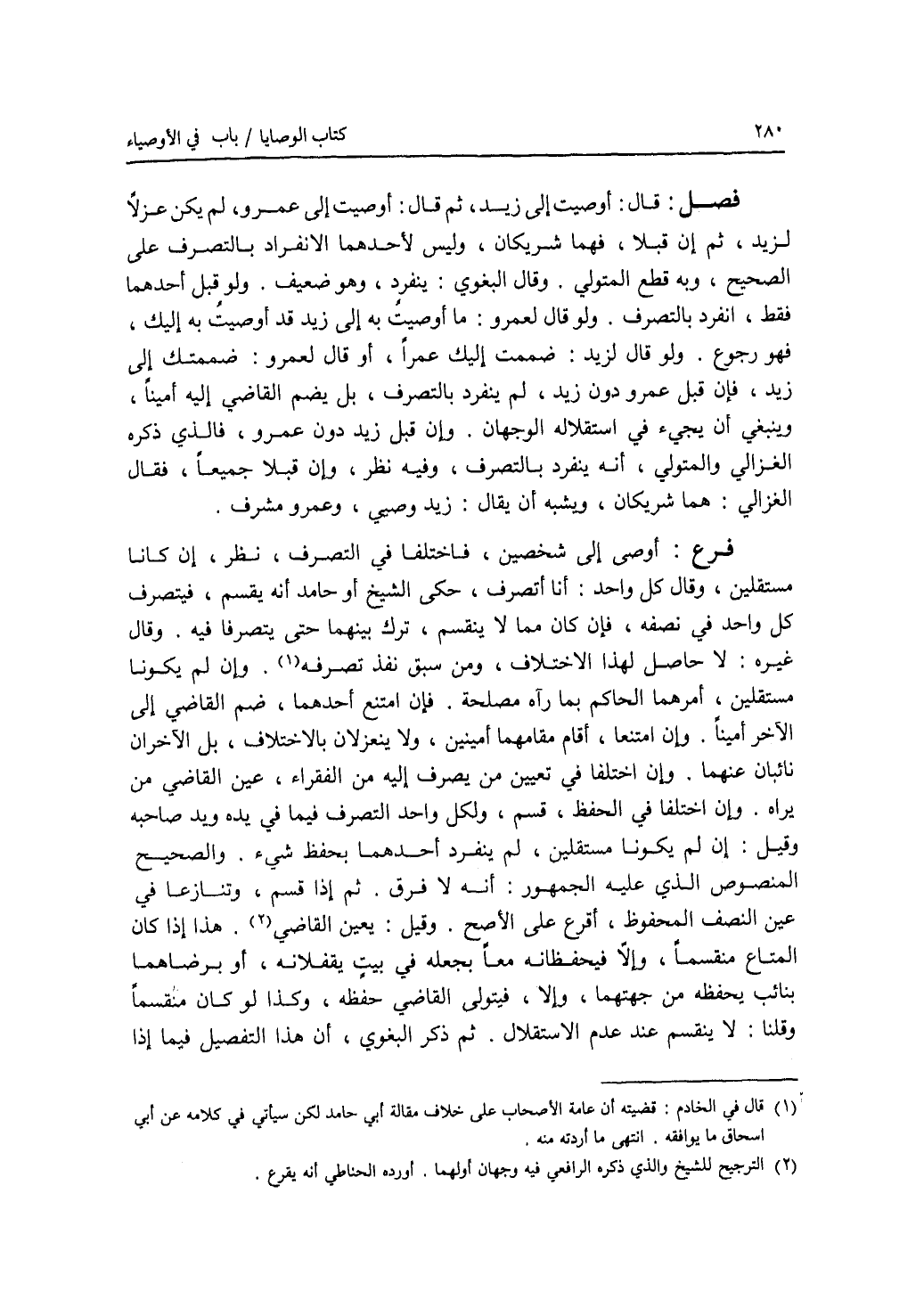 فصل قال: أوصيت إلى زيد، ثم قال: أوصيت إلى عمرو، لم يكن عزلا لزيد، ثم إن قبلا، فهما شريكان، وليس لاحدهما الانفراد بالتصرف على الصحيح، وبه قطع المتولي وقال البغوي: ينفرد، وهو ضعيف. ولو قبل أحدهما فقط، انفرد بالتصرف. ولو قال لعمرو: ما أوصيت به إلى زيد قد أوصيت به إليك، فهو رجوع. ولو قال لزيد: ضممت إليك عمرا، أو قال لعمرو: ضممتك إلى زيد، فإن قبل عمرو دون زيد لم ينفرد بالتصرف، بل يضم القاضي إليه أمينا، وينبغي أن يجئ في استقلاله الوجهان. وإن قبل زيد دون عمرو، فالذي ذكره الغزالي والمتولي، أنه ينفرد بالتصرف، وفيه نظر، وإن قبلا جميعا، فقال الغزالي: هما شريكان، ويشبه أن يقال: زيد وصيي، وعمرو مشرف. فرع أوصى إلى شخصين، فاختلفا في التصرف، نظر، إن كانا مستقلين، وقال كل واحد: أنا أتصرف، حكى الشيخ أبو حامد أنه يقسم فيتصرف كل واحد في نصفه، فإن كان مما لا ينقسم، ترك بينهما حتى يتصرفا فيه. وقال غيره: لا حاصل لهذا الاختلاف، ومن سبق نفذ تصرفه. وإن لم يكونا مستقلين، أمرهما الحا كم بما رآه مصلحة. فإن امتنع أحدهما، ضم القاضي إلى الآخر أمينا. وإن امتنعا، أقام مقامهما أمينين، ولا ينعزلان بالاختلاف، بل الآخران نائبان عنهما. وإن اختلفا في تعيين من يصرف إليه من الفقراء، عين القاضي من يراه. وإن اختلفا في الحفظ، قسم، ولكل واحد التصرف فيما في يده ويد صاحبه. وقيل: إن لم يكونا مستقلين، لم ينفرد أحدهما بحفظ شئ. والصحيح المنصوص الذي عليه الجمهور: أنه لا فرق. ثم إذا قسم، وتنازعا في عين النصف المحفوظ، أقرع على الاصح. وقيل: يعين القاضي. هذا إذا كان المتاع منقسما، وإلا فيحفظانه معا بجعله في بيت يقفلانه، أو برضاهما بنائب يحفظه من جهتهما، وإلا، فيتولى القاضي حفظه، وكذا لو كان منقسما وقلنا: لا ينقسم عند عدم الاستقلال. ثم ذكر البغوي، أن هذا التفصيل فيما إذا