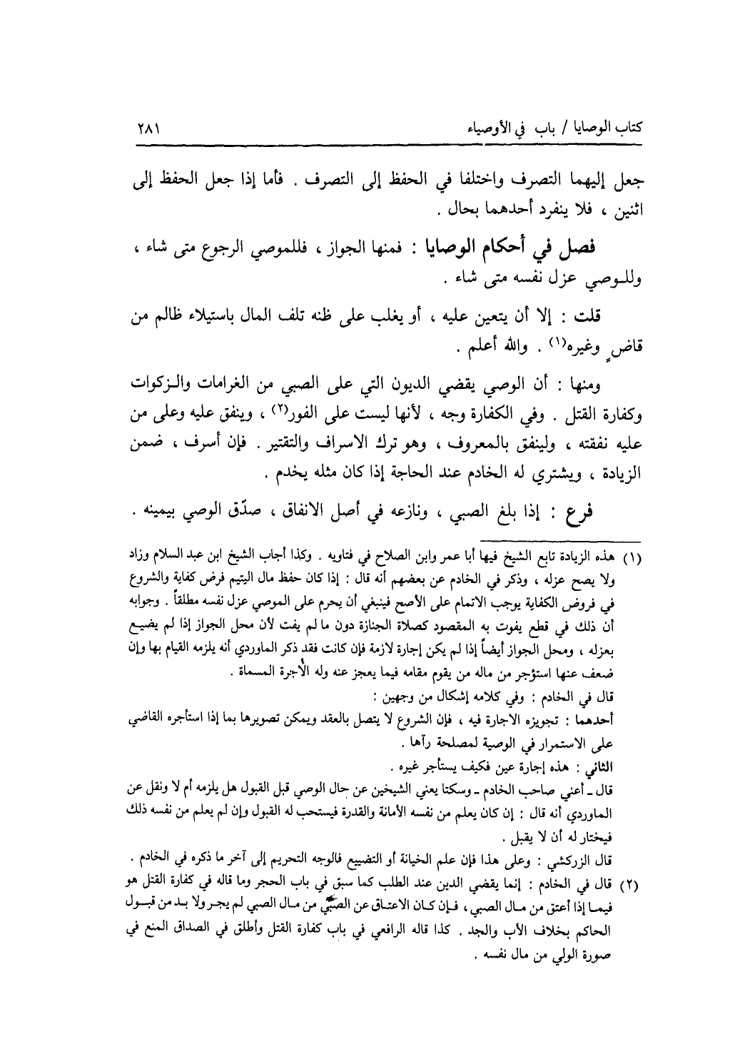 فصل في أحكام الوصاية فمنها الجواز، فللموصي الرجوع متى شاء، وللموصي عزل نفسه متى شاء. قلت: إلا أن يتعين عليه، أو يغلب على ظنه تلف المال باستيلاء ظالم من قاض وغيره. والله أعلم. ومنها: أن الوصي يقضي الديون التي على الصبي من الغرامات والزكوات وكفارة القتل. وفي الكفارة وجه، لانها ليست على الفور، وينفق عليه وعلى من عليه نفقته، ولينفق بالمعروف، وهو ترك الاسراف والتقتير. فان أسرف، ضمن الزيادة، ويشتري له الخادم عند الحاجة إذا كان مثله يخدم. فرع إذا بلغ الصبي، ونازعه في أصل الانفاق، صدق الوصي بيمينه.