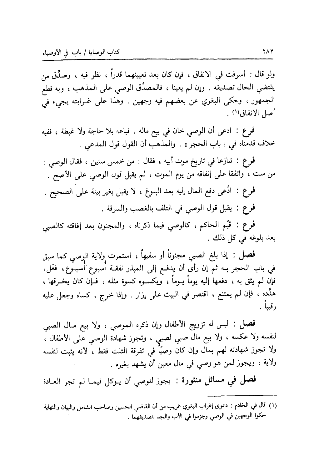 ولو قال: أسرفت في الانفا، فإن كان بعد تعيينهما قدرا، نظر فيه، وصدق من يقتضي الحال تصديقه. وإن لم يعينا، فالمصدق الوصي على المذهب، وبه قطع الجمهور، وحكى البغوي عن بعضهم فيه وجهين، وهذا على غرابته يجئ في أصل الانفاق. فرع ادعى أن الوصي خان في بيع ماله، فباعه بلا حاجة ولا غبطة، ففيه خلاف قدمناه في باب الحجر. والمذهب أن القول قول المدعي. فرع تنازعا في تاريخ موت أبيه، فقال: من خمس سنين، فقال الوصي: من ست، واتفقا على إنفاقه من يوم الموت لم يقبل قول الوصي على الاصح. فرع ادعى دفع المال إليه بعد البلوغ، لا يقبل بغير بينة على الصحيح. فرع يقبل قول الوصي في التلف بالغصب والسرقة. فرع قيم الحاكم، كالوصي فيما ذكرناه، والمجنون بعد إفاقته كالصبي بعد بلوغه في كل ذلك. فصل إذا بلغ الصبي مجنونا أو سفيها، استمرت ولاية الصبي كما سبق في باب الحجر، ثم إن رأى أن يدفع إلى المبذر نفقة أسبوع أسبوع، فعل، فإن لم يثق به، دفعها إليه يوما يوما، ويكسوه كسوة مثله، فإن كان يخرقها، هدده، فإن لم يمتنع، اقتصر في البيت على إزار. وإذا خرج، كساه وجعل عليه رقيبا.