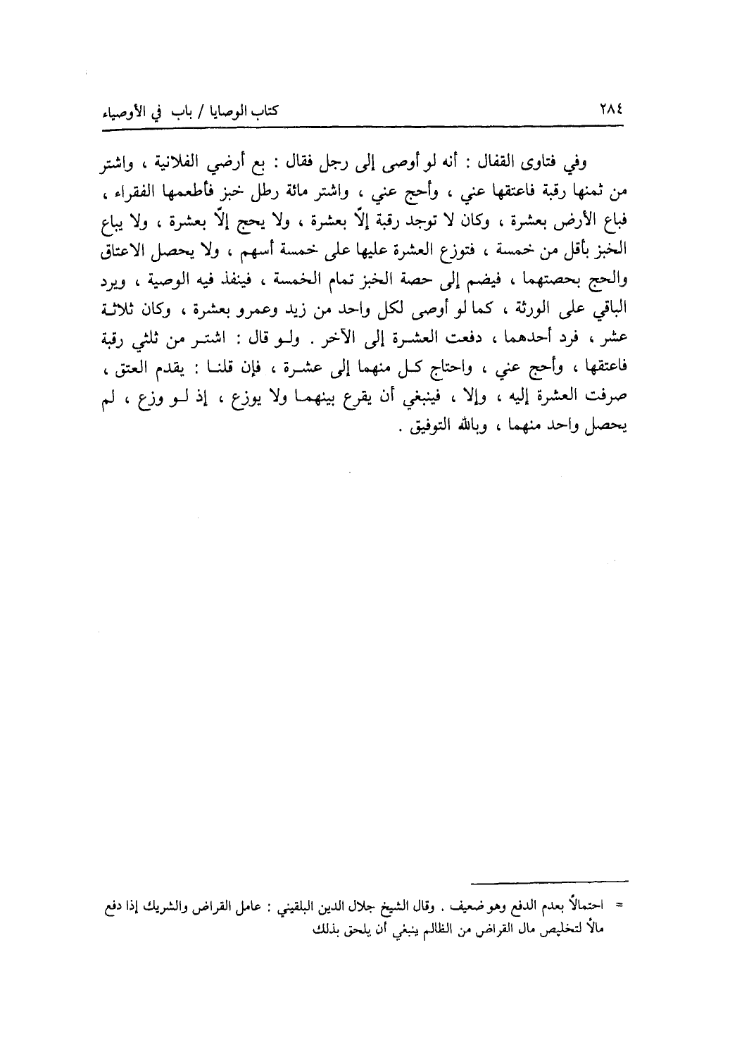 وفي فتاوى القفال: أنه لو أوصى إلى رجل فقال: بع أرضي الفلانية، واشتر من ثمنها رقبة فاعتقها عني، وأحج عني، واشتر مائة رطل خبز فأطعمها الفقراء، فباع الارض بعشرة، وكان لا توجد رقبة إلا بعشرة، ولا يحج إلا بعشرة، ولا يباع الخبز بأقل من خمسة، فتوزع العشر عليها خمسة أسهم، ولا يحصل الاعتاق والحج بحصتهما، فيضم إلى حصة الخبز تمام الخمسة، فينفذ فيه الوصية، ويرد الباقي على الورثة، كما لو أوصى لكل واحد من زيد وعمرو بعشرة، وكان ثلاثة عشر، فرد أحدهما، دفعت العشرة إلى الآخر. ولو قال: اشتر من ثلثي رقبة فاعتقها، وأحج عني، واحتاج كل منهما إلى عشرة، فإن قلنا: يقدم العتق، صرفت العشرة إليه، وإلا، فينبغي أن يقرع بينهما ولا يوزع، إذ لو وزع، لم يحصل واحد منهما، وبالله التوفيق.