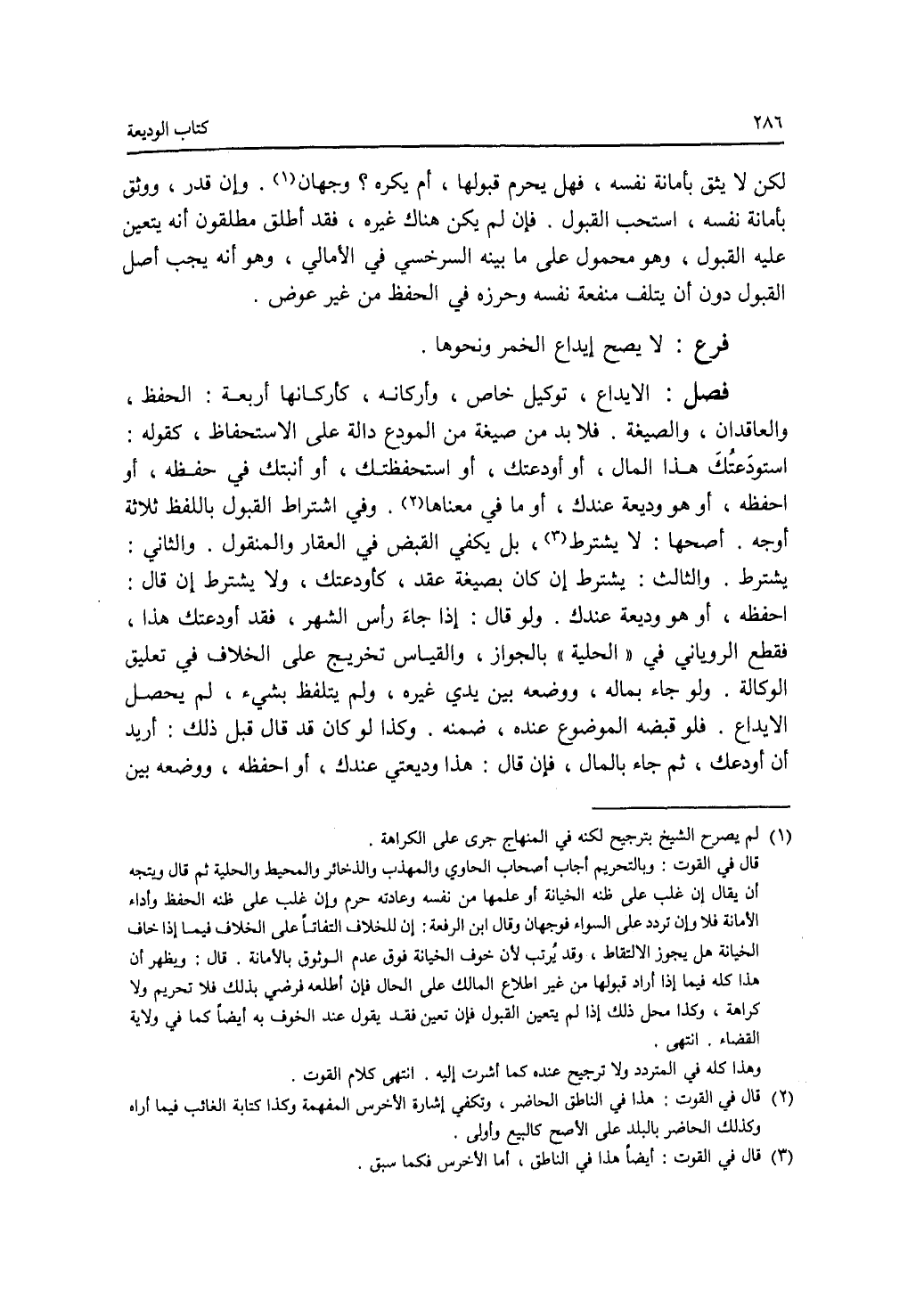 لكن لا يثق بأمانة نفسه، فهل يحرم قبولها، أم يكره ؟ وجهان. وإن قدر، ووثق بأمانة نفسه، استحب القبول. فإن لم يكن هناك غيره، فقد أطلق مطلقون أنه يتعين عليه القبول، وهو محمول على ما بينه السرخسي في الامالي، وهو أنه يجب أصل القبول دون أن يتلف منفعة نفسه وحرزه في الحفظ من غير عوض. فرع لا يصح إيداع الخمر ونحوها.
