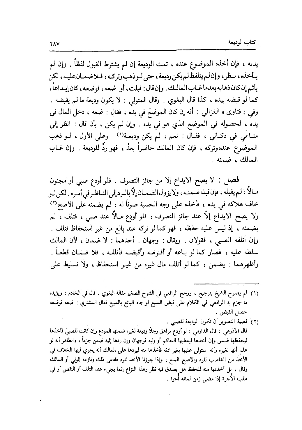 فصل لا يصح الايداع إلا من جائز التصرف. فلو أودع صبي أو مجنون مالا، لم يقبله، فإن قبله، ضمنه، ولا يزول الضمان إلا بالرد إلى الناظر في أمره. لكن لو خاف هلاكه في يده فأخذه على وجه الحسبة صونا له، لم يضمنه على الاصح. ولا يصح الايداع إلا عند جائز التصرف، فلو أودع مالا عند صبي، فتلف، لم يضمنه، إذ ليس عليه حفظه، فهو كما لو تركه عند بالغ من غير استحفاظ فتلف. وإن أتلفه الصبي، فقولان. ويقال: وجهان. أحدهما: لا ضمان، لان المالك سلطه عليه، فصار كما لو باعه أو أقرضه وأقبضه فأتلفه، فلا ضمان قطعا. وأظهرهما: يضمن، كما لو أتلف مال غيره من غير استحفاظ. ولا تسليط على