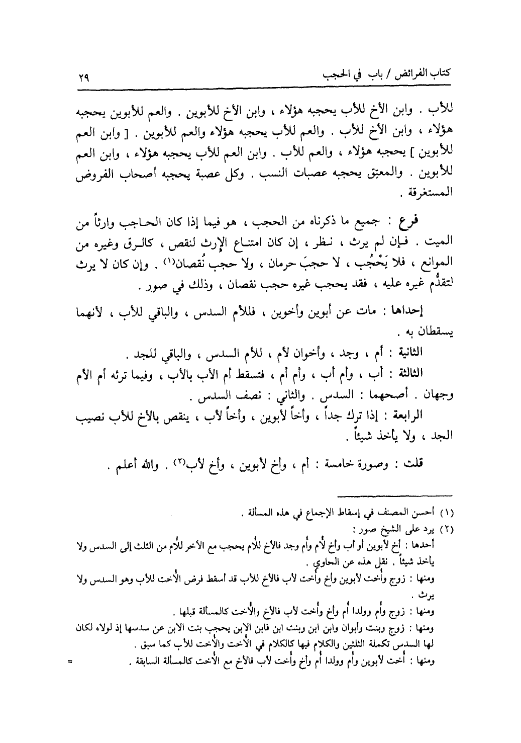للاب. وابن الاخ للاب يحجبه هؤلاء، وابن الاخ للابوين. والعم للابوين يحجبه هؤلاء، وابن الاخ للاب. والعم للاب يحجبه هؤلاء، والعم للابوين. وابن العم للابوين يحجبه هؤلاء، والعم للاب. وابن العم للاب يحجبه هؤلاء، وابن العم للابوين. والمعتق يحجبه عصبات النسب. وكل عصبة يحجبه أصحاب الفروض المستغرقة. فرع جميع ما ذكرناه من الحجب، هو فيما إذا كان الحاجب وارثا من الميت. فإن لم يرث، نظر، إن كان امتناع الارث لنقص، كالرق وغيره من الموانع، فلا يحجب، لاحجب حرمان، ولا حجب نقصان. وإن كان لا يرث لتقدم غيره عليه، فقد يحجب غيره حجب نقصان، وذلك في صور. إحداها: مات عن أبوين وأخوين، فللام السدس، والباقي للاب، لانهما يسقطان به. الثانية: أم، وجد، وأخوان لام، للام السد س، والباقي للجد. الثالثة: أب، وأم أب، وأم أم، فتسقط أم الاب بالاب، وفيما ترثه أم الام وجهان. أصحهما: السدس. والثاني: نصف السدس. الرابعة: إذا ترك جدا، وأخا لابوين، وأخا لاب، ينقص بالاخ للاب نصيب الجد، ولا يأخذ شيئا. قلت: وصورة خامسة: أم، وأخ لابوين، وأخ لاب. والله أعلم.