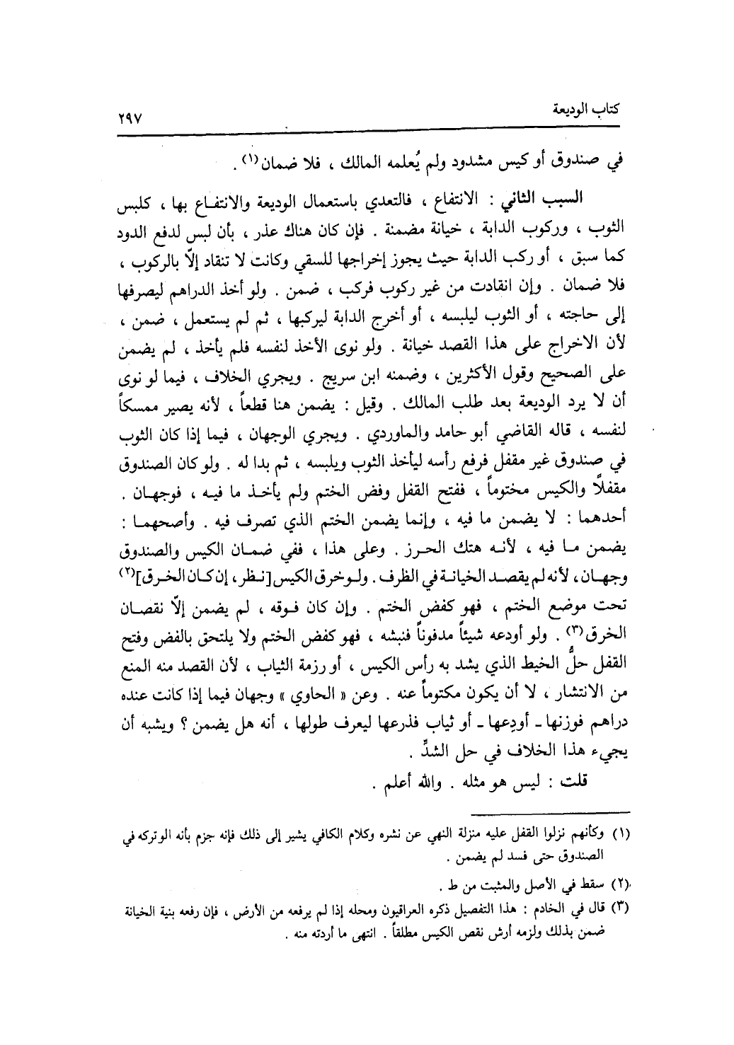 في صندوق أو كيس مشدود ولم يعلمه المالك، فلا ضمان. السبب السادس: الانتفاع. فالتعدي باستعمال الوديعة والانتفاع بها، كلبس الثوب، وركوب الدابة، خيانة مضمنة. فإن كان هناك عذر، بأن لبس لدفع الدود كما سبق، أو ركب الدابة حيث يجوز إخراجها للسقي وكانت لا تنقاد إلا بالركوب، فلا ضمان. وإن انقادت من غير ركوب فركب، ضمن. ولو أخذ الدراهم ليصرفها إلى حاجته، أو الثوب ليلبسه، أو أخرج الدابة ليركبها، ثم لم يستعمل، ضمن، لان الاخراج على هذا القصد خيانة. ولو نوى الاخذ لنفسه فلم يأخذ، لم يضمن على الصحيح وقول الاكثرين، وضمنه ابن سريج. ويجري الخلاف، فيما لو نوى أن لا يرد الوديعة بعد طلب المالك. وقيل: يضمن هنا قطعا، لانه يصير ممسكا لنفسه، قاله القاضي أبو حامد والماوردي. ويجري الوجهان، فيما إذا كان الثوب في صندوق غير مقفل فرفع رأسه ليأخذ الثوب ويلبسه، ثم بدا له. ولو كالصندوق مقفلا والكيس مختوما، ففتح القفل وفض الختم ولم يأخذ ما فيه، فوجهان. أحد هما: لا يضمن ما فيه، وانما يضمن الختم الذي تصرف فيه. وأصحهما: يضمن ما فيه، لانه هتك الحرز. وعلى هذا، ففي ضمان الكيس والصندوق وجهان، لانه لم يقصد الخيانة في الظرف. ولو خرق الكيس نظر، إن كان الخرق تحت موضع الختم، فهو كفض الختم. وإن كاق فوقه، لم يضمن إلا نقصان الخرق. ولو أودعه شيئا مدفونا فنبشه، فهو كفض الختم. ولا يلتحق بالفض وفتح القفل حل الخيط الذي يشد به رأس الكيس، أو رزمة الثياب، لان القصد منه المنع من الانتشار، لا أن يكون مكتوما عنه. وعن الحاوي وجهان فيما إذا كانت عنده دراهم فوزنها - أودعها - أو ثياب فذرعها ليعرف طولها، أنه هل يضمن ؟ ويشبه أن يجئ هذا الخلاف في حل الشد. قلت: ليس هو مثله. والله أعلم.