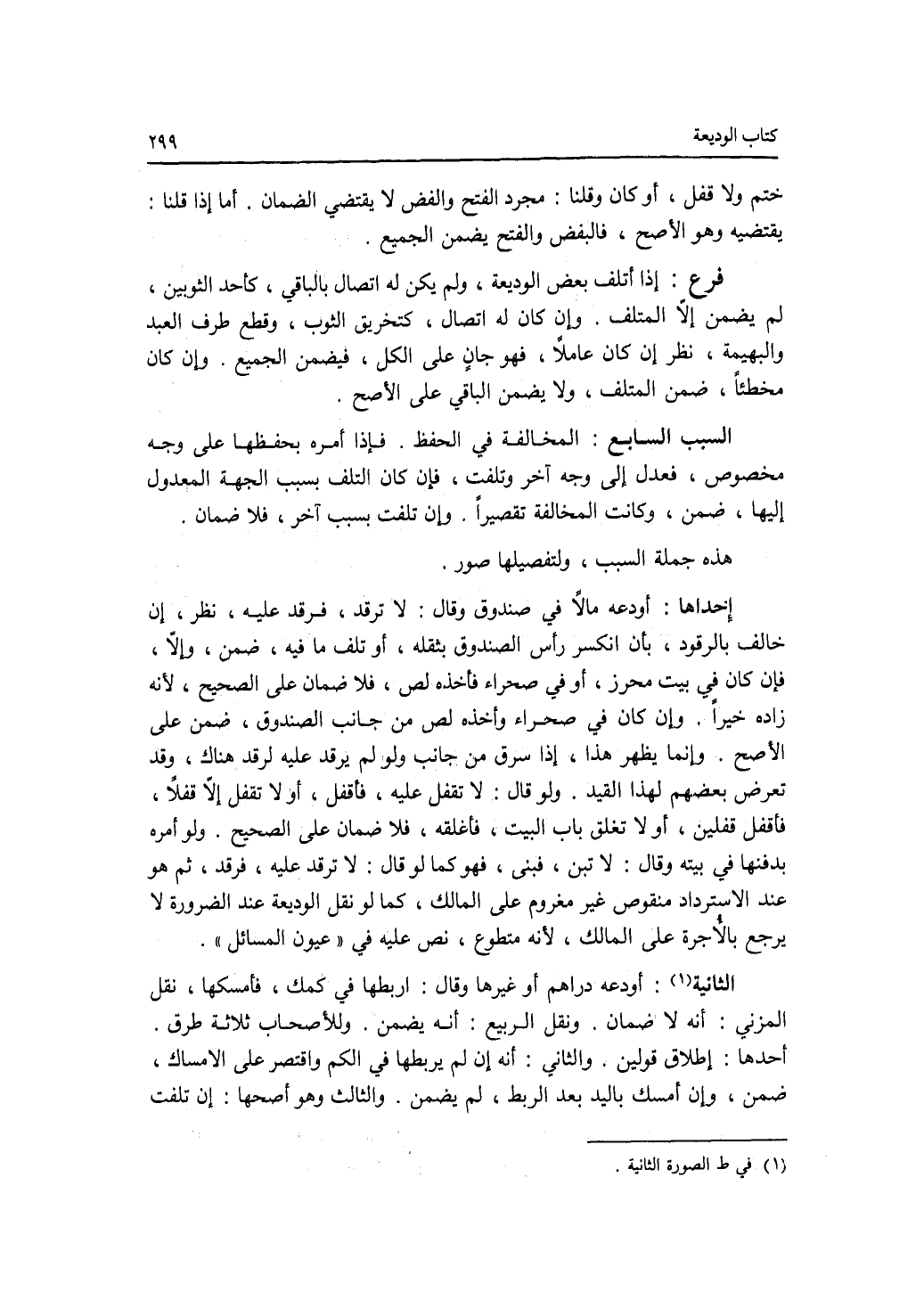 ختم ولا قفل، أو كان وقلنا: مجرد الفتح والفض لا يقتضي الضمان. أما إذا قلنا: يقتضيه وهو الاصح، فبالفض والفتح يضمن الجميع. فرع إذا أتلف بعض الوديعة، ولم يكن له اتصال بالباقي، كأحد الثوبين، لم يضمن إلا المتلف. وإن كان له اتصال، كتحريق الثوب، وقطع طرف العبد والبهيمة، نظر إن كان عاملا، فهو جان على الكل، فيضمن الجميع. وإن كان مخطئا، ضمن المتلف، ولا يضمن الباقي على الاصح. السبب السابع: المخالفة في الحفظ. فإذا أمره بحفظها على وجه مخصوص، فعدل إلى وجه آخر وتلفت، فإن كان التلف بسبب الجهة المعدول إليها، ضمن، وكانت المخالفة تقصيرا. وإن تلفت بسبب آخر، فلا ضمان. هذه جملة السبب، ولتفصيلها صور. إحداها: أودعه مالا في صندوق وقال: لا ترقد، فرقد عليه، نظر، إن خالف بالرقود، بأن انكسر رأس الصندوق بثقله، أو تلف ما فيه، ضمن، وإلا، فإن كان في بيت محرز، أو في صحراء فأخذه لص، فلا ضمان على الصحيح، لانه زاده خيرا. وإن كان في صحراء وأخذه لص من جان الصندوق، ضمن على الاصح. وإنما يظهر هذا، إذا سرق من جانب لو لم يرقد عليه لرقد هناك، وقد تعرض بعضهم لهذا القيد. ولو قال: لا تقفل عليه، فأقفل، أو لا تقفل إلا قفلا، فأقفل قفلين، أو لا تغلق باب البيت، فأغلقه، فلا ضمان على الصحيح. ولو أمره بدفنها في بيته وقال: لا تبن، فبنى، فهو كما لو قال: لا ترقد عليه، فرقد، ثم هو عند الاسترداد منقوص غير مغروم على المالك، كما لو نقل الوديعة عند الضرورة لا يرجع بالاجرة على المالك، لانه متطوع، نص عليه في عيون المسائل. (الصورة) الثانية: أودعه دراهم أو غيرها وقال: اربطها في كمك، فأمسكها، نقل المزني: أنه لا ضمان. ونقل الربيع: أنه يضمن. وللاصحاب ثلاثة طرق. أحدها: إطلاق قولين. والثاني: أنه إن لم يربطها في الكم واقتصر على الامساك، ضمن، وإن أمسك باليد بعد الربط، لم يضمن، والثالث وهو أصحها: إن تلفت