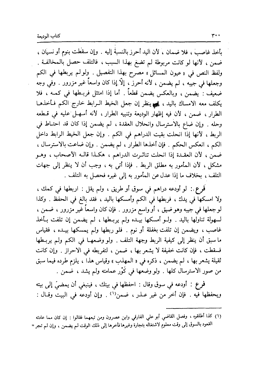 بأخذ غاصب، فلا ضمان، لان اليد أحرز بالنسبة إليه. وإن سقطت بنوم أو نسيان، ضمن، لانها لو كانت مربوطة لم تضع بهذا السبب، فالتلف حصل بالمخالفة. ولفظ النص في عيون المسائل مصرح بهذا التفصيل. ولو لم يربطها في الكم وجعلها في جيبه، لم يضمن، لانه أحرز، إلا إذا كان واسعا غير مزرور. وفي وجه ضعيف: يضمن، بالعكس يضمن قطعا. أما إذا امتثل فربطها في كمه، فلا يكلف معه الامساك باليد، ثم ينظر إن جعل الخيط الرابط خارج الكم فأخذها الطرار، ضمن، لان فيه إظهار الوديعة وتنبيه الطرار، لانه أسهل عليه في قطعه وحله. وإن ضاع بالاسترسال وانحلال العقدة، لم يضمن إذا كان قد احتاط في الربط، لانها إذا انحلت بقيت الدراهم في الكم. وإن جعل الخيط الرابط داخل الكم، انعكس الحكم. فإن أخذها الطرار، لم يضمن. وإن ضاعت بالاسترسال، ضمن، لان العقدة إذا انحلت تناثرت الدراهم، هكذا قاله الاصحاب، وهو مشكل، لان المأمور به مطلق الربط. فإذا أتى به، وجب أن لا ينظر إلى جهات التلف، بخلافما إذا عدل عن المأمور به إلى غيره فحصل به التلف. فرع لو أودعه دراهم في سوق أو طريق، ولم يقل: اربطها في كمك، ولا امسكها في يدك، فربطها في الكم وأمسكها باليد، فقد بالغ في الحفظ. وكذا لو جعلها في جيبه وهو ضيق، أو واسع مزرور. فإن كان واسعا غير مزرور، ضمن، لسهولة تناولها باليد. ولو أمسكها بيده ولم يربطها، لم يضمن إن تلفت بأخذ غاصب، ويضمن إن تلفت بغفلة أو نوم. فلو ربطها ولم يمسكها بيده، فقياس ما سبق أن ينظر إلى كيفية الربط وجهة التلف. ولو وضعها في الكم ولم يربطها فسقطت، فان كانت خفيفة لا يشعر بها، ضمن، لتفريطه في الاحراز، وإن كانت ثقيلة يشعر بها، لم يضمن، ذكره في المهذب وقياس هذا، يلزم طرده فيما سبق من صور الاسترسال كلها. ولو وضعها في كور عمامته ولم يشد، ضمن. فرع أودعه في سوق وقال: احفظها في بيتك، فينبغي أن يمضي إلى بيته ويحفظها فيه. فإن أخر من غير عذر، ضمن. وإن أودعه في البيت وقال: