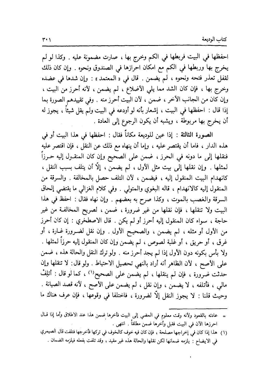 احفظها في البيت فربطها في الكم وخرج بها، صارت مضمونة عليه. وكذا لو لم يخرج بها وربطها في الكم مع إمكان إحرازها في الصندوق ونحوه، وإن كان ذلك لقفل تعذر فتحه ونحوه. لم يضمن. قال في المعتمد: وإن شدها في عضده وخرج بها، فإن كان الشد مما يلي الاضلاع، لم يضمن، لانه أحرز من البيت، وإن كان من الجانب الآخر، ضمن، لان البيت أحرز منه. وفي تقييدهم الصورة بما إذا قال: احفظها في البيت، إشعار بأنه لو أودعه في البيت ولم يقل شيئا، يجوز له أن يخرج بها مربوطة، ويشبه أن يكون الرجوع إلى العادة. الصورة الثالثة: إذا عين للوديعة مكانا فقال: احفظها في هذا البيت أو في هذه الدار، فأما أن يقتصر عليه، وإما أن ينهاه مع ذلك عن النقل، فإن اقتصر عليه فنقلها إلى ما دونه في الحرز، ضمن على الصحيح وإن كان المنقول إليه حرزا لمثلها. وإن نقلها إلى بيت مثل الاول، لم يضمن، إلا أن يتلف بسبب النقل، كانهدام البيت المنقول إليه، فيضمن، لان التلف حصل بالمخالفة. والسرقة من المنقول إليه كالانهدام، قاله البغوي والمتولي. وفي كلام الغزالي ما يقتضي إلحاق السرقة والغصب بالموت، وكذا صرح به بعضهم. وإن نهاه فقال: احفظ في هذا البيت ولا تنقلها، فإن نقلها من غير ضرورة، ضمن، لصريح المخالفة من غير حاجة، سواء كان المنقول إليه أحرز أو لم يكن. قال الاصطخري: إن كان أحرز من الاول أو مثله، لم يضمن، والصحيح الاول. وإن نقل لضرورة غارة، أو غرق، أو حريق، أو غلبة لصوص، لم يضمن وإن كان المنقول إليه حرزا لمثلها. ولا بأس بكونه دون الاول إذا لم يجد أحرز منه. ولو ترك النقل والحالة هذه، ضمن على الاصح، لان الظاهر أنه أراد بالنهي تحصيل الاحتياط. ولو قال: لا تنقلها وإن حدثت ضرورة، فإن لم ينقلها، لم يضمن على الصحيح، كما لو قال: أتلف مالي، فأتلفه، لا يضمن، وإن نقل، لم يضمن على الاصح، لانه قصد الصيانة. وحيث قلنا: لا يجوز النقل إلا لضرورة، فاختلفا في وقوعها، فإن عرف هناك ما