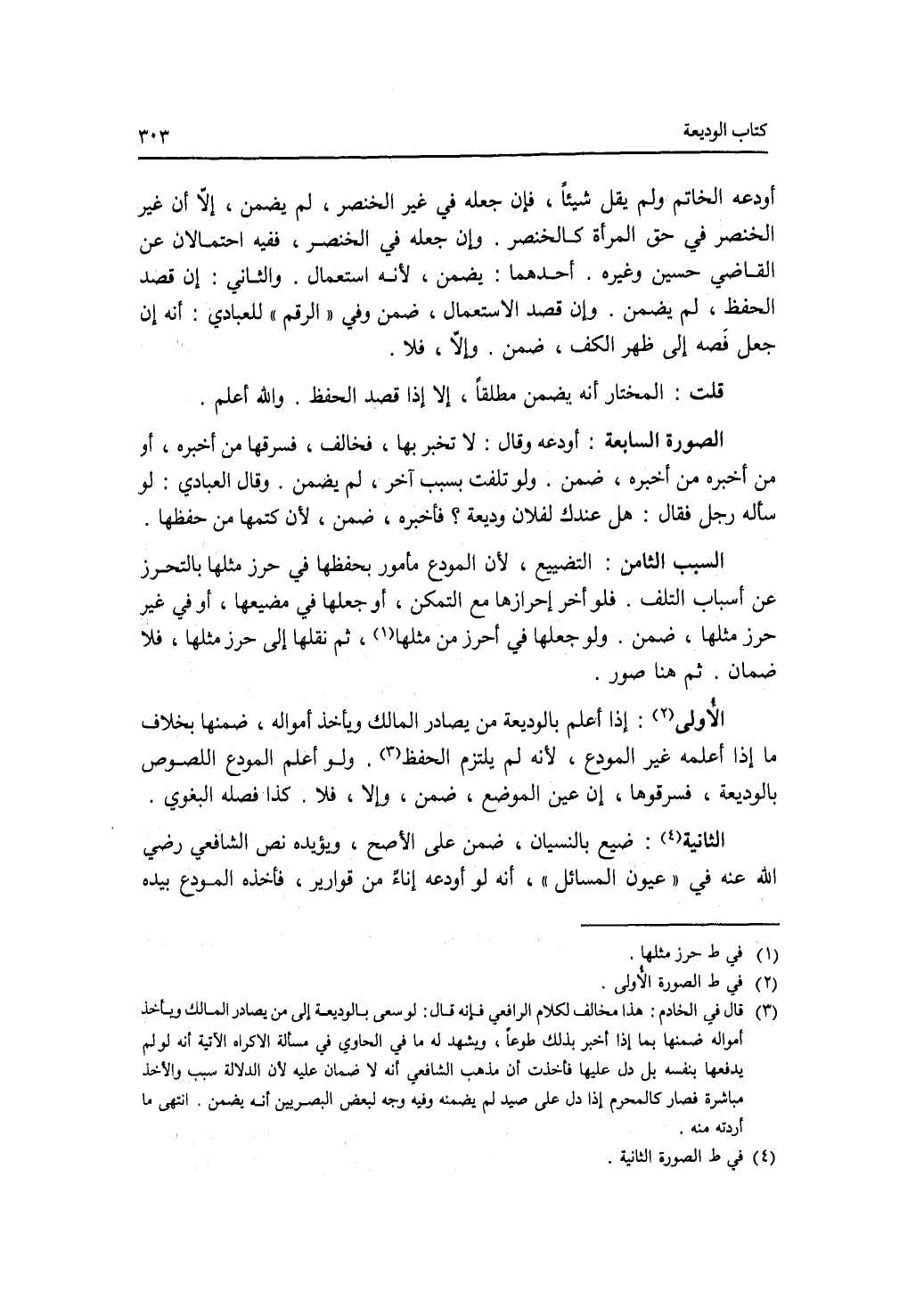 أودعه الخاتم ولم يقل شيئا، فإن جعله في غير الخنصر، لم يضمن، الا أن غير الخنصر في حق المرأة كالخنصر. وإن جعله في الخنصر، ففيه احتمالان عن القاضي حسين وغيره. أحدهما: يضمن، لانه استعمال. والثاني: إن قصد الحفظ، لم يضمن. وإن قصد الاستعمال، ضمن وفي الرقم للعبادي: أنه إن جعل فصه إلى ظهر الكف، ضمن. وإلا، فلا. قلت: المختار أنه يضمن مطلقا، إلا إذا قصد الحفظ. والله أعلم. (الصورة) السابعة: أودعه وقال: لا تخبر بها، فخالف، فسرقها من أخبره، أو من أخبره من أخبره، ضمن. ولو تلفت بسبب آخر، لم يضمن. وقال العبادي: لو سأله رجل فقال: هل عندك لفلان وديعة ؟ فأخبره، ضمن، لان كتمها من حفظها. السبب الثامن: التضييع، لان المودع مأمور بحفظها في حرز مثلها بالتحرز عن أسباب التلف. فلو أخر إحرازها مع التمكن، أو جعلها في مضيعها، أو في غير حرز مثلها، ضمن. ولو جعلها في أحرز من حرز مثلها، ثم نقلها إلى حرز مثلها، فلا ضمان. ثم هنا صور. (الصورة) الاولى: إذا أعلم بالوديعة من يصادر المالك ويأخذ أمواله، ضمنها. بخلاف ما إذا أعلمه غير المودع، لانه لم يلتزم الحفظ. ولو أعلم المودع اللصوص بالوديعة، فسرقوها، إن عين الموضع، ضمن، وإلا، فلا. كذا فصله البغوي. (الصورة) الثانية: ضيع بالنسيان، ضمن على الاصح، ويؤيده نص الشافعي رضي الله عنه في عيون المسائل، أنه لو أودعه إناء من قوارير، فأخذه المودع بيده