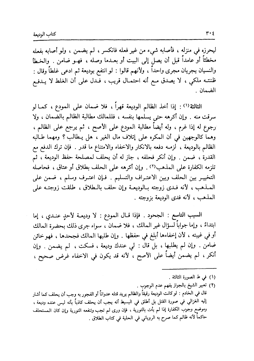 ليحرزه في منزله، فأصابه شئ من غير فعله فانكسر، لم يضمن، ولو أصابه بفعله مخطئا أو عامدا قبل أن يصل إلى البيت أو بعدما وصله، فهو ضامن. والخطأ والنسيان يجريان مجرى واحدا، ولانهم قالوا: لو انتفع بوديعة ثم ادعى غلطا وقال: ظننته ملكي، لا يصدق مع أنه احتمال قريب، فدل على أن الغلط لا يدفع الضمان. (الصورة) الثالثة: إذا أخذ الظالم الوديعة قهرا، فلا ضمان على المودع، كما لو سرقت منه. وإن أكرهه حتى يسلمها بنفسه، فللمالك مطالبة الظالم بالضمان، ولا رجوع له إذا غرم، وله أيضا مطالبة المودع على الاصح، ثم يرجع على الظالم، وهما كالوجهين في أن المكره على إتلاف مال الغير، هل يطالب ؟ ومهما طالبه الظالم بالوديعة، لزمه دفعه بالانكار والاخفاء والامتناع ما قدر. فإن ترك الدفع مع القدرة، ضمن. وإن أنكر فحلفه، جاز له أن يحلف لمصلحة حفظ الوديعة، ثم تلزمه الكفارة على المذهب. وإن أكرهه على الحلف بطلاق أو عتاق، فحاصله التخيير بين الحلف وبين الاعتراف والتسليم. فإن اعترف وسلم، ضمن على المذهب، لانه فدى زوجته بالوديعة. وإن حلف بالطلاق، طلقت زوجته على المذهب، لانه فدى الوديعة بزوجته. السبب التاسع: الجحود. فإذا قال المودع: لا وديع لاحد عندي، إما ابتداء، وإما جوابا لسؤال غير المالك، فلا ضمان، سواء جرى ذلك بحضرة المالك أو في غيبته، لان إخفاءها أبلغ في حفظها. وإن طلبها المال ك فجحدها، فهو خائن ضامن. وإن لم يطلبها، بل قال: لي عندك وديعة، فسكت، ليضمن. وإن أنكر، لم يضمن أيضا على الاصح، لانه قد يكون في الاخفاء غرض صحيح