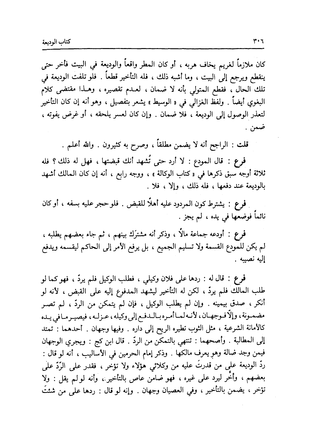كان ملازما لغريم يخاف هربه، أو كان المطر واقعا والوديعة في البيتفأخر حتى ينقطع ويرجع إلى البيت، وما أشبه ذلك، فله التأخير قطعا. فلو تلفت الوديعة في تلك الحال، فقطع المتولي بأنه لا ضمان، لعدم تقصيره، وهذا مقتضى كلام البغوي أيضا. ولفظ الغزالي في الوسيط يشعر بتفصيل، وهو أنه إن كان التأخير لتعذر الوصول إلى الوديعة، فلا ضمان. وإن كان لعسر يلحقه، أو غرض يفوته، ضمن. قلت: الراجح أنه لا يضمن مطلقا، وصرح به كثيرون. والله أعلم. فرع قال المودع: لا أرد حتى تشهد أنك قبضتها، فهل له ذلك ؟ فله ثلاثة أوجه سبق ذكرها في كتاب الوكالة ووجه رابع، أنه إن كان المالك أشهد بالوديعة عند دفعها، فله ذلك، وإلا، فلا. فرع يشترط كون المردود عليه أهلا للقبض. فلو حجر عليه بسفه، أو كان نائما فوضعها في يده، لم يجز. فرع أودعه جماعة مالا، وذكر أنه مشترك بينهم، ثم جاء بعضهم يطلبه، لم يكن للمودع القسمة ولا تسليم الجميع، بل يرفع الامر إلى الحاكم ليقسمه ويدفع إليه نصيبه. فرع قال له: ردها على فلان وكيلي، فطلب الوكيل فلم يرد، فهو كما لو طلب المالك فلم يرد، لكن له التأخير ليشهد المدفوع إليه على القبض، لانه لو أنكر، صدق بيمينه. وإن لم يطلب الوكيل، فإن لم يتمكن من الرد، لم تصر مضمونة، وإلا، فوجهان، لانه لما أمره بالدفع إلى وكيله، عزله، فيصير ما في يده كالامانة الشرعية، مثل الثوب تطيره الريح إلى داره. وفيها وجهان. أحدهما: تمتد إلى المطالبة. وأصحهما: تنتهي بالتمكن من الرد. قال ابن كج: ويجري الوجهان فيمن وجد ضالة وهو يعرف مالكها. وذكر إمام الحرمين في الاساليب، أنه لو قال: رد الوديعة على من قدرت عليه من وكلائي هؤلاء ولا تؤخر، فقدر على الرد على بعضهم، وأخر ليرد على غيره، فهو ضامن عاص بالتأخير، وأنه لو لم يقل: ولا تؤخر، يضمن بالتأخير، وفي العصيان وجهان. وإنه لو قال: ردها على من شئت