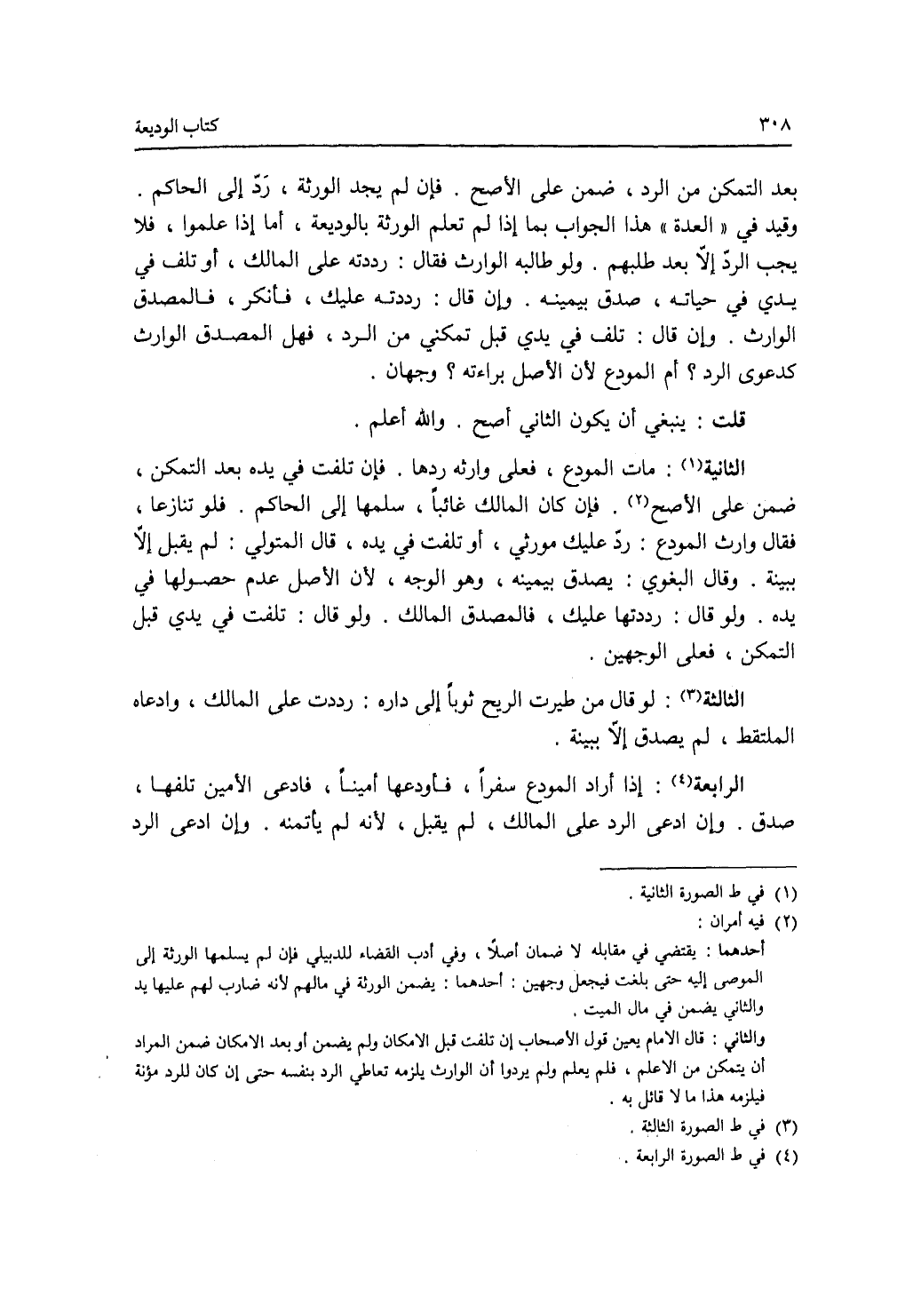 بعد التمكن من الرد، ضمن على الاصح. فإن لم يجد الورثة، رد إلى الحاكم. وقيد في العدة هذا الجواب بما إذا لم تعلم الورثة بالوديعة، أما إذ علموا، فلا يجب الرد إلا بعد طلبهم. ولو طالبه الوارث فقال: رددته على المالك، أو تلف في يدي في حياته، صدق بيمينه. وإن قال: رددته عليك، فأنكر، فالمصدق الوارث. وإن قال: تلف في يدي قبل تمكني من الرد، فهل المصدق الوارث كدعوى الرد ؟ أم المودع لان الاصل براءته ؟ وجهان. قلت: ينبغي أن يكون الثاني أصح. والله أعلم. (الصورة) الثانية: مات المودع، فعلى وارثه ردها. فإن تلفت في يده بعد التمكن، ضمن على الاصح. فإن كان المالك غائبا، سلمها إلى الحاكم. فلو تنازعا، فقال وارث المودع: رد عليك مورثي، أو تلفت في يده، قال المتولي: لم يقبل إلا ببينة. وقال البغوي: يصدق بيمينه، وهو الوجه، لان الاصل عدم حصولها في يده. ولو قال: رددتها عليك، فالمصدق المالك. ولو قال: تلفت في يدي قبل التمكن، فعلى الوجهين. (الصورة) الثالثة: لو قال من طيرت الريح ثوبا إلى داره: رددت على المالك، وادعاه الملتقط، لم يصدق إلا ببينة. (الصورة) الرابعة: إذا أراد المودع سفرا، فأودعها أمينا، فادعى الامين تلفها، صدق. وإن ادعى الرد المالك، لم يقبل، لانه لم يأتمنه. وإن ادعى الرد