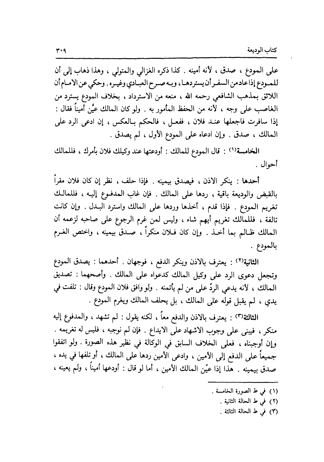 على المودع، صدق، لانه أمينه. كذا ذكره الغزالي والمتولي، وهذا ذهاب إلى أن للمودع إذا عاد من السفر أن يستردها، وبه صرح العبادي وغيره. وحكي عن الامام أن اللائق بمذهب الشافعي رحمه الله، منعه من الاسترداد، بخلاف المودع يسترد من الغاصب على وجه، لانه من الحفظ المأمور به. ولو كان المالك عين أمينا فقال: إذا سافرت فاجعلها عند فلان، ففعل، فالحكم بالعكس، إن ادعى الرد على المالك، صدق. وإن ادعاه على المودع الاول، لم يصدق. (الصورة) الخامسة: قال المودع للمالك: أودعتها عند وكيلك فلان بأمرك، فللمالك أحوال. أحدها: ينكر الاذن، فيصدق بيمينه. فإذا حلف، نظر إن كان فلان مقرا بالقبض والوديعة باقية، ردها على المالك. فإن غاب المدفوع إليه، فللمالك تغريم المودع. فإذا قدم، أخذها وردها على المالك واسترد البدل. وإن كانت تالفة، فللمالك تغريم أيهم شاء، وليس لمن غرم الرجوع على صاحبه لزعمه أن المالك ظالم بما أخذ. وإن كان فلان منكرا، صدق بيمينه، واختص الغرم بالمودع. (الحالة) الثانية: يعترف بالاذن وينكر الدفع، فوجهان. أحدهما: يصدق المودع وتجعل دعوى الرد على وكيل المالك كدعواه على المالك. وأصحهما: تصديق المالك، لانه يدعي الرد على من لم يأتمنه. ولو وافق فلان المودع وقال: تلفت في يدي، لم يقبل قوله على المالك، بل يحلف المالك ويغرم المودع. (الحالة) الثالثة: يعترف بالاذن والدفع معا، لكنه يقول: لم تشهد، والمدفوع إليه منكر، فيبنى على وجوب الاشهاد على الايداع. فإن لم نوجبه، فليس له تغريمه. وإن أوجبناه، فعلى الخلاف السابق في الوكالة في نظير هذه الصورة. ولو اتفقوا جميعا على الدفع إلى الامين، وادعى الامين ردها على المالك، أو تلفها في يده، صدق بيمينه. هذا إذا عين المالك الامين، أما لو قال: أودعها أمينا، ولم يعينه،
