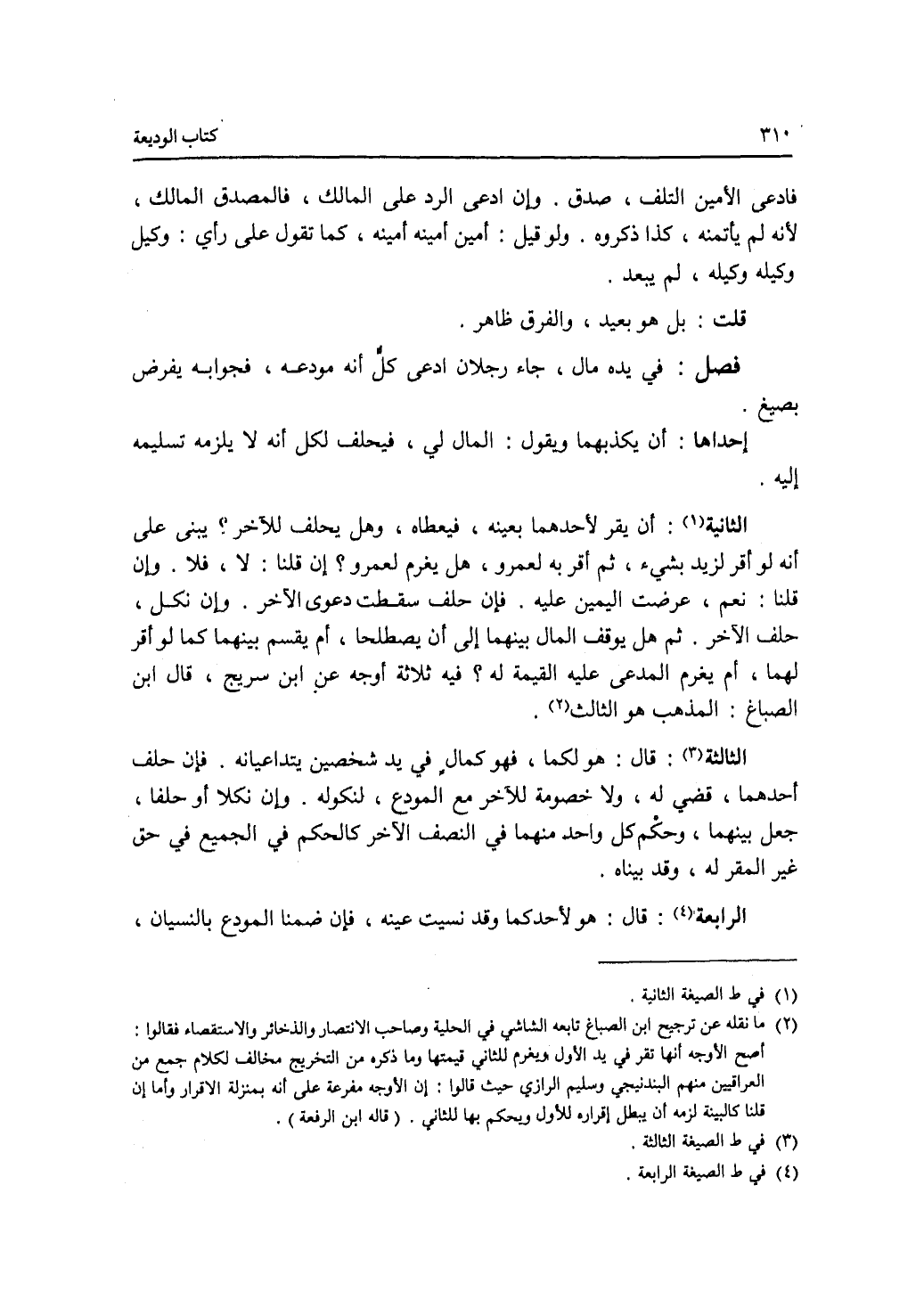 فصل في يده مال، جاء رجلان ادعى كل أنه مودعه، فجوابه يفرض بصيغ. إحداها: أن يكذبهما ويقول: المال لي، فيحلف لكل أنه لا يلزمه تسليمه إليه. (الصيغة) الثانية: أن يقر لاحدهما بعينه، فيعطاه، وهل يحلف للآخر ؟ يبنى على أنه لو أقر لزيد بشئ، ثم أقر به لعمرو، هل يغرم لعمرو ؟ إن قلنا: لا، فلا. وإن قلنا: نعم، عرضت اليمين عليه. فإن حلف، سقطت دعوى الآخر. وإن نكل، حلف الآخر. ثم هل يوقف المال بينهما إلى أن يصطلحا، أم يقسم بينهما كما لو أقر لهما، أم يغرم المدعى عليه القيمة له ؟ فيه ثلاثة أوجه عن ابن سريج، قال ابن الصباغ: المذهب هو الثالث. (الصيغة) الثالثة: قال: هو لكما، فهو كمال في يد شخصين يتداعيانه. فإن حلف أحدهما، قضي له، ولا خصومة للآخر مع المودع، لنكوله. وإن نكلا أو حلفا، جعل بينهما، وحكم كل واحد منهما في النصف الآخر كالحكم في الجميع في حق غير المقر له، وقد بيناه. (الصيغة) الرابعة: قال: هو لاحدكما وقد نسيت عينه، فإن ضمنا المودع بالنسيان،