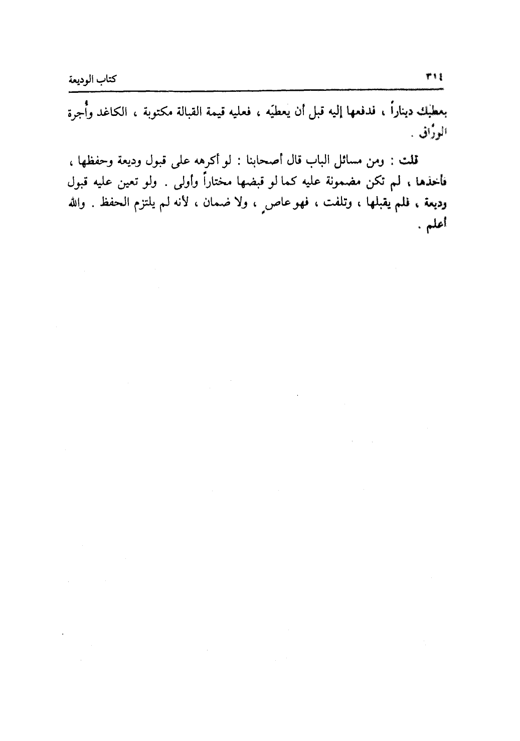 يعطيك دينارا، فدفعها إليه قبل أن يعطيه، فعليه قيمة القبالة مكتوبة، الكاغد وأجرة الوراق. قلت: ومن مسائل الباب قال أصحابنا: لو أكرهه على قبول وديعة وحفظها، فأخذها، لم تكن مضمونة عليه كما لو قبضها مختارا وأولى. ولو تعين عليه قبول وديعة، فلم يقبلها، وتلفت، فهو عاص، ولا ضمان، لانه لم يلتزم الحفظ. والله أعلم.