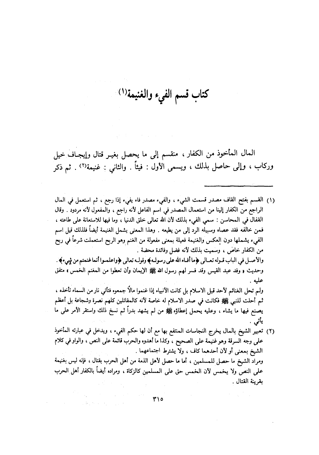 المال المأخوذ من الكفار، منقسم إلى ما يحصل بغير قتال وإيجاف خيل وركاب، وإلى حاصل بذلك، ويسمى الأول: فيئا. والثاني: غنيمة. ثم ذكر