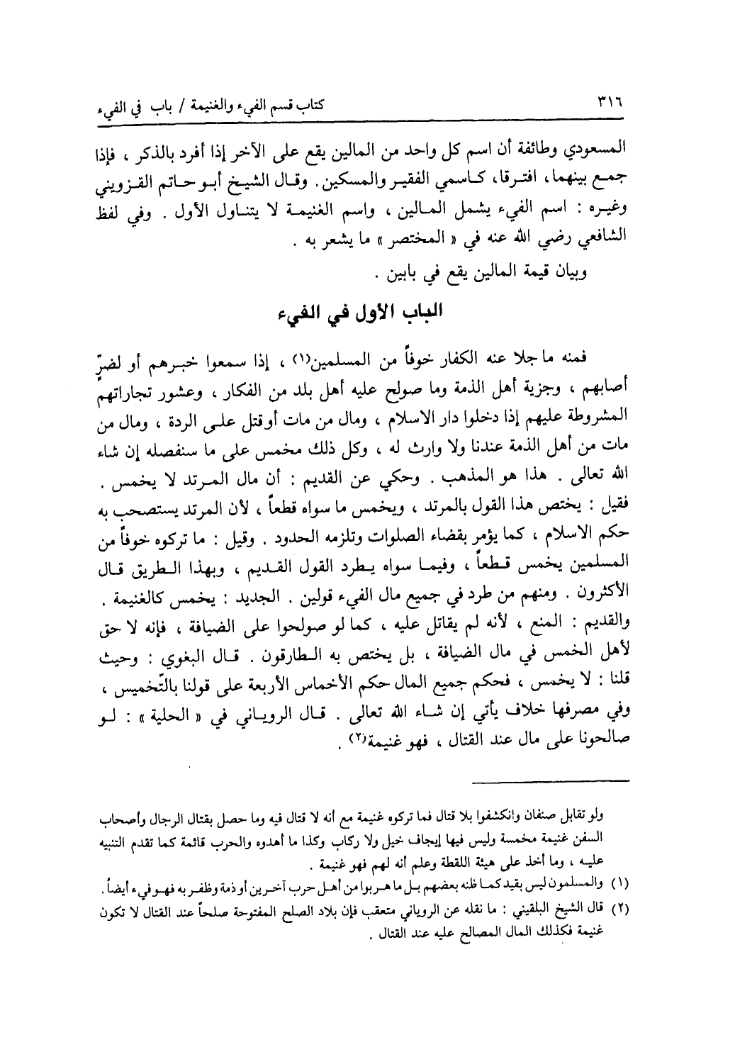 المسعودي وطائفة أن اسم كل واحد من المالين يقع على الآخر إذا أفرد بالذكر، فإذا جمع بينهما، افترقا، كاسمي الفقير والمسكين. وقال الشيخ أبو حاتم القزويني وغيره: اسم الفئ يشمل المالين، واسم الغنيمة لا يتناول الاول. وفي لفظ الشافعي رضي الله عنه في المختصر ما يشعر به. وبيان قيمة المالين يقع في بابين.