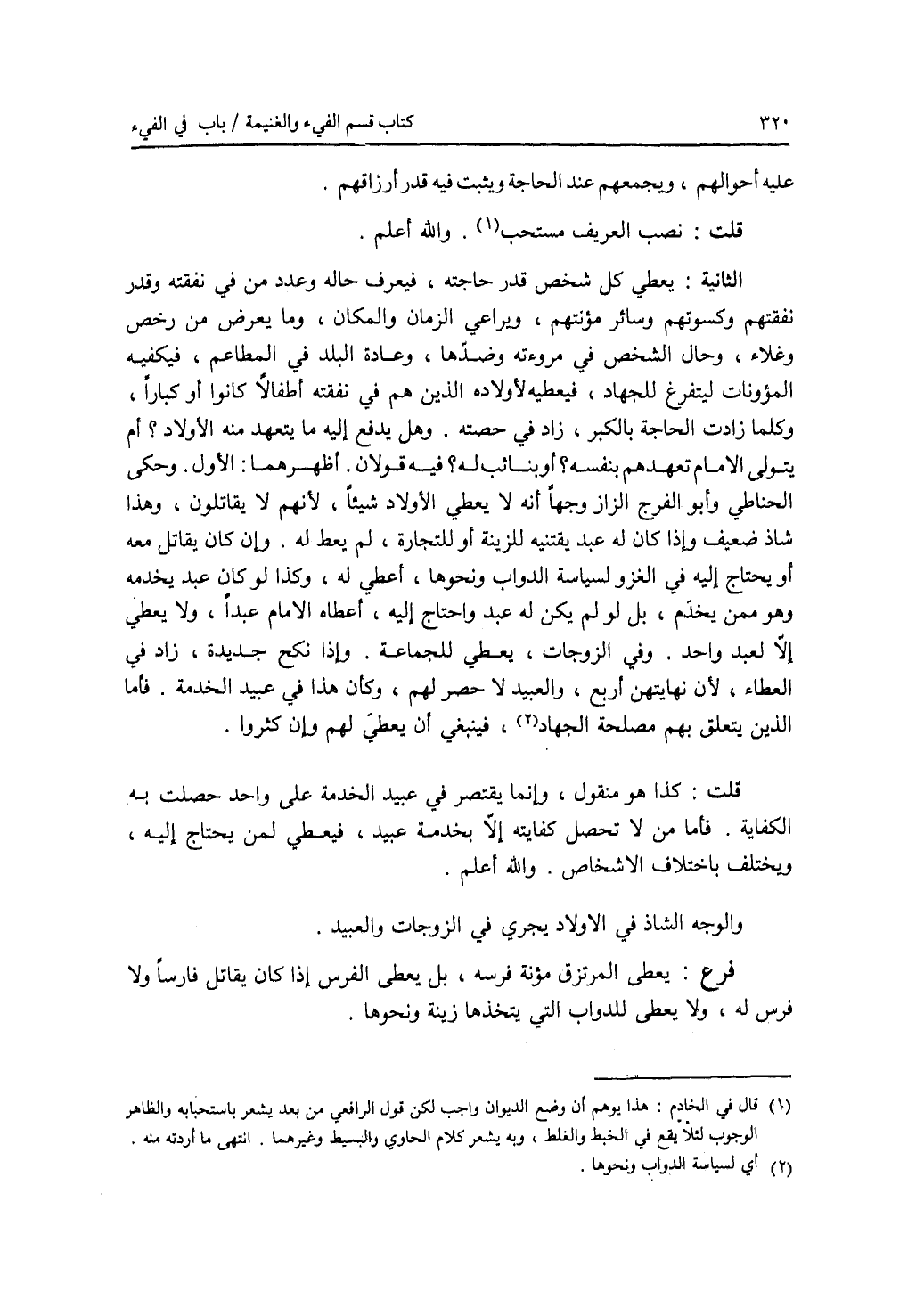 عليه أحوالهم، ويجمعهم عند الحاجة ويثبت فيه قدر أرزاقهم. قلت: نصب العريف مستحب. والله أعلم. الثانية: يعطي كل شخص قدر حاجته، فيعرف حاله وعدد من في نفقته وقدر نفقتهم وكسوتهم وسائر مؤنتهم، ويراعي الزمان والمكان، وما يعرض من رخص وغلاء، وحال الشخص في مروءته وضدها، وعادة البلد في المطاعم، فيكفيه المؤونات ليتفرغ للجهاد، فيعطيه لاولاده الذين هم في نفقته أطفالا كانوا أو كبارا، وكلما زادت الحاجة بالكبر، زاد في حصته. وهل يدفع إليه ما يتعهد منه الاولاد ؟ أم يتولى الامام تعهدهم بنفسه ؟ أو بنائب له ؟ فيه قولان. أظهرهما: الاول. وحكى الحناطي وأبو الفرج الزاز وجها أنه لا يعطي الاولاد شيئا، لانهم لا يقاتلون، وهذا شاذ ضعيف وإذا كان له عبد يقتنيه للزينة أو للتجارة، لم يعط له. وإن كان يقاتل معه أو يحتاج إليه في الغزو لسياسة الدواب ونحوها، أعطي له، وكذا لو كان عبد يخدمه وهو ممن يخدم، بل لو لم يكن له عبد واحتاج إليه، أعطاه الامام عبدا، ولا يعطي إلا لعبد واحد. وفي الزوجات، يعطي للجماعة. وإذا نك جديدة، زاد في العطاء، لان نهايتهن أربع، والعبيد لا حصر لهم، وكأن هذا في عبيد الخدمة. فأما الذين يتعلق بهم مصلحة الجهاد، فينبغي أن يعطي لهم وإن كثروا. قلت: كذا هو منقول، وإنما يقتصر في عبيد الخدمة على واحد إذا حصلت به الكفاية. فأما من لا تحصل كفايته إلا بخدمة عبيد، فيعطي لمن يحتاج إليه، ويختلف باختلاف الاشخاص. والله أعلم. والوجه الشاذ في الاولاد يجري في الزوجات والعبيد. فرع يعطى المرتزق مؤنة فرسه، بل يعطى الفرس إذا كان يقاتل فارسا ولا فرس له، ولا يعطى للدواب التي يتخذها زينة ونحوها.