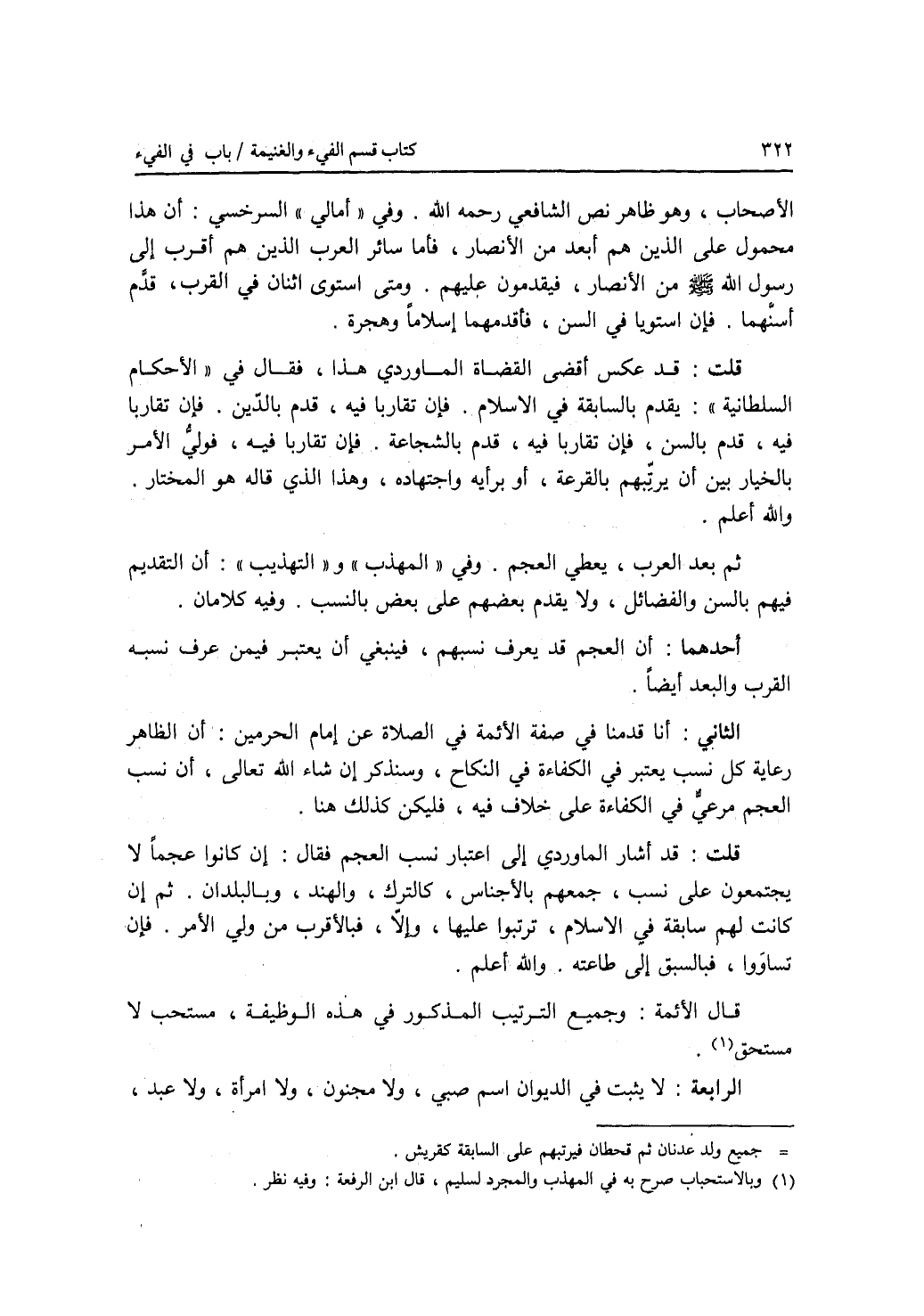 الاصحاب، وهو ظاهر نص الشافعي رحمه الله. وفي أمالي السرخسي: أن هذا محمول على الذين هم أبعد من الانصار، فأما سائر العرب الذين هم أقرب إلى رسول الله - صلى الله عليه وسلم - من الانصار، فيقدمون عليهم. ومتى استوى اثنان في القرب، قدم أسنهما. فإن استويا في السن، فأقدمهما إسلاما وهجرة. قلت: قد عكس أقضى القضاة الماوردي هذا، فقال في الاحكام السلطانية: يقدم بالسابقة في الاسلام. فإن تقاربا فيه، قدم بالدين. فإن تقاربا فيه، قدم بالسن، فإن تقاربا، قدم بالشجاعة. فإن تقاربا فيه، فولي الامر بالخيار بين أن يرتبهم بالقرعة، أو برأيه واجتهاده، وهذا الذي قاله هو المختار. والله أعلم. ثم بعد العرب، يعطى العجم. وفي المهذب والتهذيب: أن التقديم فيهم بالسن والفضائل، ولا يقدم بعضهم على بعض بالنسب، وفيه كلامان. أحدهما: أن العجم قد يعرف نسبهم، فينبغي أن يعتبر فيمن عرف نسبه القرب والبعد أيضا. الثاني: أنا قدمنا في صفة الائمة في الصلاة عن إمام الحرمين: أن الظاهر رعاية كل نسب يعتبر في الكفاءة في النكاح، وسنذكر إن شاء الله تعالى، أن نسب العجم مرعي في الكفاءة على خلاف فيه، فليكن كذلك هنا. قلت: قد أشار الماوردي إلى اعتبار نسب العجم فقال: إن كانوا عجما لا يجتمعون على نسب، جمعهم بالاجناس، كالترك، والهند، وبالبلدان. ثم إن كانت لهم سابقة في الاسلام، ترتبوا عليها، وإلا، فبالاقرب من ولي الامر. فإن تساووا، فبالسبق إلى طاعته. والله أعلم. قال الائمة: وجميع الترتيب المذكور في هذه الوظيفة، مستحب لا مستحق. الرابعة: لا يثبت في الديوان اسم صبي، ولا مجنون، ولا امرأة، ولا عبد،