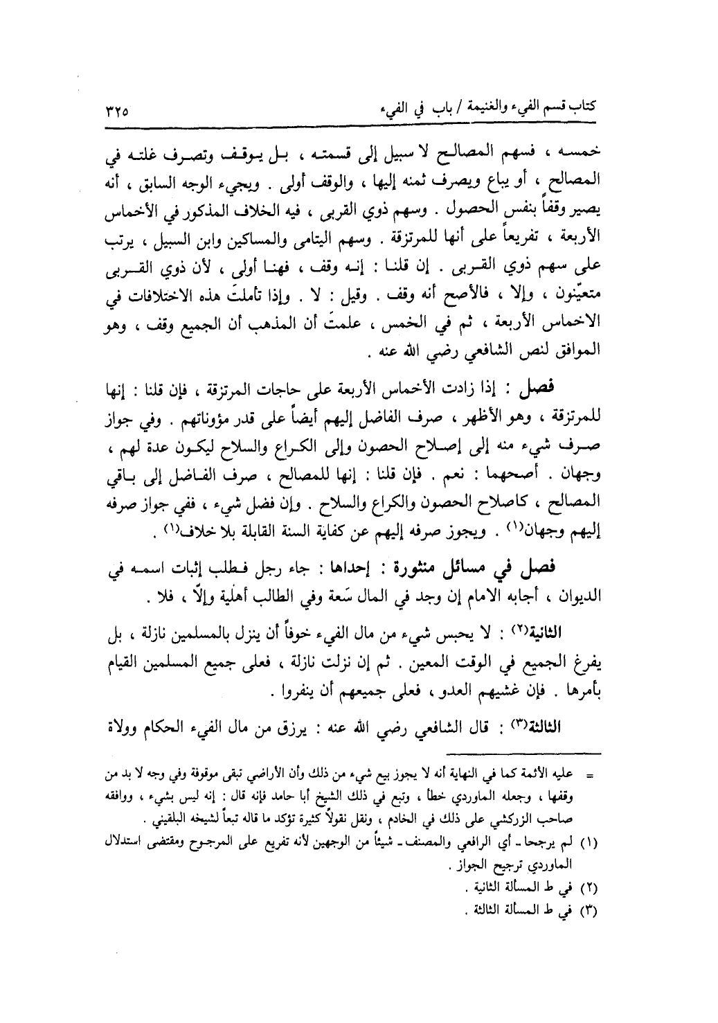 خمسه، فسهم المصالح لا سبيل إلى قسمته، بل يوقف وتصرف غلته في المصالح، أو يباع ويصرف ثمنه إليها، والوقف أولى ويجئ الوجه السابق، أنه يصير وقفا بنفس الحصول. وسهم ذوي القربى، فيه الخلاف المذكور في الاخماس الاربعة، تفريعا على أنها للمرتزقة. وسهم اليتامى والمساكين وابن السبيل، يرتب على سهم ذوي القربى. إن قلنا: إنه وقف، فهنا أولى، ولان ذوي القربى متعينون، وإلا، فالاصح أنه وقف. وقيل: لا. وإذا تأملت هذه الاختلافات في الاخماس الاربعة، ثم في الخمس، علمت أن المذهب أن الجميع وقف، وهو الموافق لنص الشافعي رضي الله عنه.