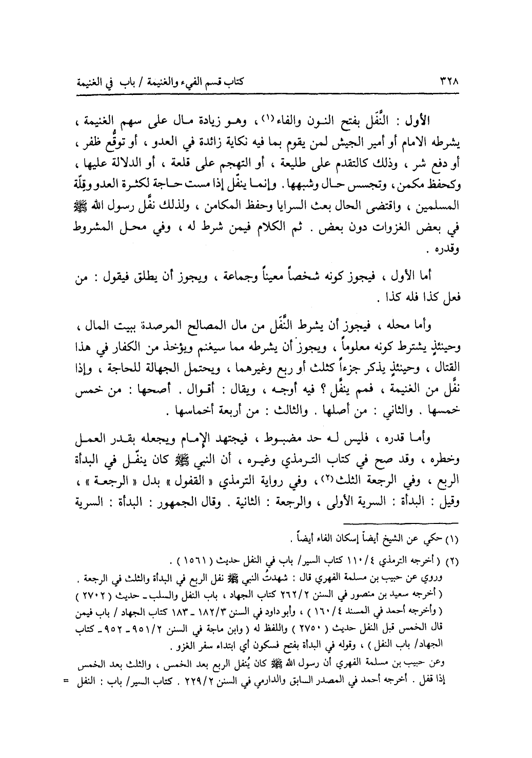 الأول : النفل بفتح النون والفاء، وهو زيادة مال على سهم الغنيمة، يشرطه الامام أو أمير الجيش لمن يقوم بما فيه نكاية زائدة في العدو، أو توقع ظفر، أو دفع شر، وذلك كالتقدم على طليعة، أو التهجم على قلعة، أو الدلالة عليها، وكحفظ مكمن، وتجسس حال وشبهها. وإنما ينفل إذا مست حاجة لكثرة العدو وقلة المسلمين، واقتضى الحال بعث السرايا وحفظ المكامن، ولذلك نفل رسول الله - صلى الله عليه وسلم - في بعض الغزوات دون بعض. ثم الكلام فيمن شرط له، وفي محل المشروط وقدره. أما الاول، فيجوز كونه شخصا معينا وجماعة، ويجوز أن يطلق فيقول: من فعل كذا فله كذا. وأما محله، فيجوز أن يشرط النفل من مال المصالح المرصدة ببيت المال، وحينئذ يشترط كونه معلوما، ويجوز أن يشرطه مما سيغنم ويؤخذ من الكفار في هذا القتال، وحينئذ يذكر جزءا كثلث أو ربع وغيرهما، ويحتمل الجهالة للحاجة. وإذا نفل من الغنيم، فمم ينفل ؟ فيه أوجه، ويقال: أقوال. أصحها: من خمس خمسها. والثاني: من أصلها. والثالث: من أربعة أخماسها. وأما قدره، فليس له حد مضبوط، فيجتهد الامام ويجعله بقدر العمل وخطره، وقد صح في كتاب الترمذي وغيره، أن النبي - صلى الله عليه وسلم - كان ينفل في البدأة الربع، وفي الرجعة الثلث، وفي رواية الترمذي القفول بدل الرجعة، وقيل: البدأة: السرية الاولى، والرجعة: الثانية. وقال الجمهور: البدأة: السرية