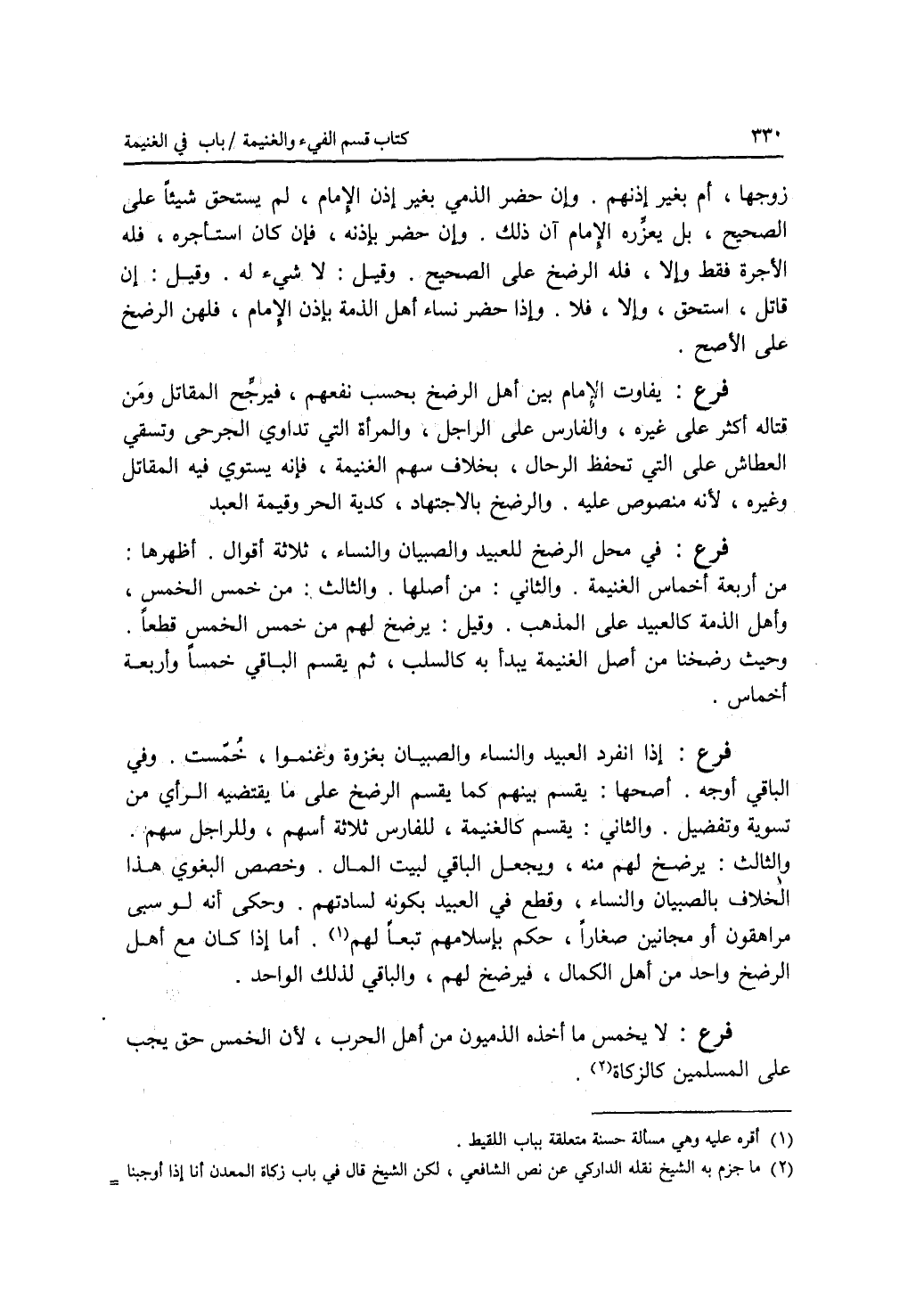 زوجها، أم بغير إذنهم. وإن حضر الذمي بغير إذن الامام، لم يستحق شيئا على الصحيح، بل يعزره الامام آن ذلك. وإن حضر بإذنه، فإن كان استأجره، فله الاجرة فقط، وإلا، فله الرضخ على الصحيح. وقيل: لا شئ له. وقيل: إن قاتل، استحق، وإلا، فلا. وإذا حضر نساء أهل الذمة بإذن الامام، فلهن الرضخ على الاصح. فرع يفاوت الامام بين أهل الرضخ بحسب نفعهم، فيرجح المقاتل ومن قتاله أكثر على غيره، والفارس على الراجل، والمرأة التي تداوي الجرحى وتسقي العطاش على التي تحفظ الرجال، بخلاف سهم الغنيمة، فإنه يستوي فيه المقاتل وغيره، لانه منصوص عليه. والرضخ بالاجتهاد، كدية الحر وقيمة العبد. فرع في محل الرضخ للعبيد والصبيان والنساء، ثلاثة أقوال. أظهرها: من أربعة أخماس الغنيمة. والثاني: من أصلها. والثالث: من خمس الخمس، وأهل الذمة كالعبيد على المذهب. وقيل: يرضخ لهم من خمس الخمس قطعا. وحيث رضخنا من أصل الغنيمة يبدأ به كالسلب، ثم يقسم الباقي خمسا وأربعة أخماس. فرع إذا انفرد العبيد والنساء والصبيان بغزوة وغنموا، خمست. وفي الباقي أوجه. أصحها: يقسم بينهم كما يقسم الرضخ على ما يقتضيه الرأي من تسوية وتفضيل. والثاني: يقسم كالغنيمة، للفارس ثلاثة أسهم، وللراجل سهم. والثالث: يرضخ لهم منه، ويجعل الباقي لبيت المال. وخصص البغوي هذا الخلاف بالصبيان والنساء، وقطع في العبيد بكونه لسادتهم، وحكى أنه لو سبى مراهقون أو مجانين صغارا، حكم باسلامهم تبعا لهم. أما إذا كان مع أهل الرضخ واحد من أهل الكمال، فيرضخ لهم، والباقي لذلك الواحد. فرع لا يخمس ما أخذه الذميون من أهل الحرب، لان الخمس حق يجب على المسلمين كالزكاة.