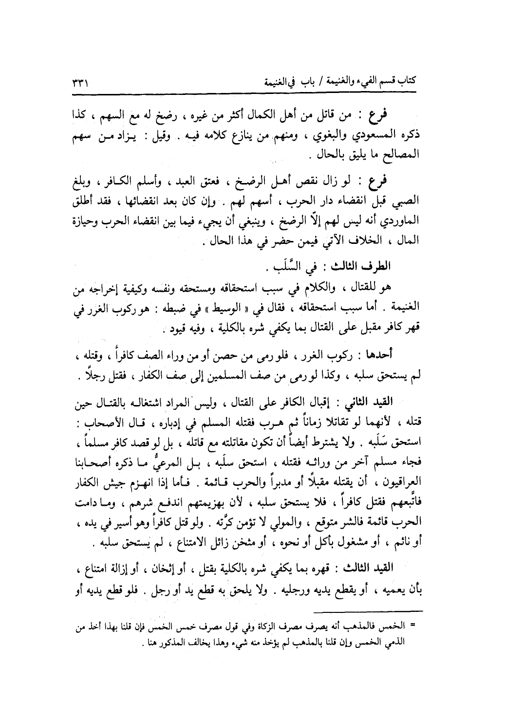 الطرف الثالث : في السلب. هو للقتال، والكلام في سبب استحقاقه ومستحقه ونفسه وكيفية إخراجه من الغنيمة. أما سبب استحقاقه، فقال في الوسيط في ضبطه: هو ركوب الغرر في قهر كافر مقبل على القتال بما يكفي شره بالكلية، وفيه قيود. أحدها: ركوب الغرر. فلو رمى من حصن أو من وراء الصف كافرا، وقتله، لم يستحق سلبه، وكذا لو رمى من صف المسلمين إلى صف الكفار، فقتل رجلا. (القيد) الثاني: إقبال الكافر على القتال، وليس المراد اشتغاله بالقتال حين قتله، لانهما لو تقاتلا زمانا ثم هر ب فقتله المسلم في إدباره، قال الاصحاب: استحق سلبه. ولا يشترط أيضا أن تكون مقاتلته مع قاتله، بل لو قصد كافر مسلما، فجاء مسلم آخر من ورائه فقتله، استحق سلبه، بل المرعي ما ذكره أصحابنا العراقيون، أن يقتله مقبلا أو مدبرا والحرب قائمة فأما إذا انهزم جيش الكفار فاتبعهم فقتل كافرا، فلا يستحق سلبه، لان بهزيمتهم اندفع شرهم، وما دامت الحرب قائمة فالشر متوقع، والمولي لا تؤمن كرته. ولو قتل كافرا وهو أسير في يده، أو نائم، أو مشغول بأكل أو نحوه، أو مثخن زائل الامتناع، لم يستحق سلبه. القيد الثالث: قهره بما يكفي شره بالكلية بقتل، أو إثخان، أو إزالة امتناع، بأن يعميه، أو يقطع يديه ورجليه. ولا يلحق به قطع يد أو رجل. فلو قطع يديه أو رجليه، أو