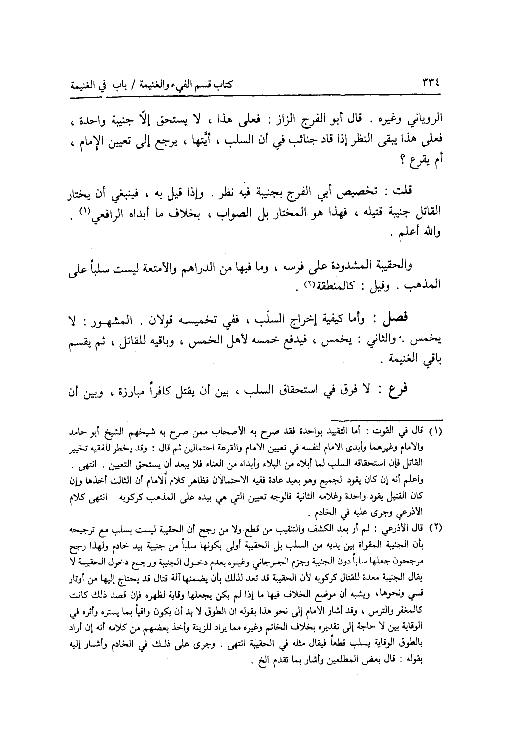 الروياني وغيره. قال أبو الفرج الزاز: فعلى هذا، لا يستحق إلا جنيبة واحدة، فعلى هذا يبقى النظر إذا قاد جنائب في أن السلب، أيتها، يرجع إلى تعيين الامام، أم يقرع ؟ قلت: تخصيص أبي الفرج بجنيبه فيه نظر. وإذا قيل به، فينبغي أن يختار القاتل جنيبة قتيله، فهذا هو المختار بل الصواب، بخلاف ما أبداه الرافعي. والله أعلم. والحقيبة المشدودة على فرسه، وما فيها من الدراهم والامتعة ليست سلبا على المذهب. وقيل: كالمنطقة. فصل وأما كيفية إخراج السلب، ففي تخميسه قولان. المشهور: لا يخمس. والثاني: يخمس، فيدفع خمسه لاهل الخمس، وباقيه للقاتل، ثم يقسم باقي الغنيمة. فرع لا فرق في استحقاق السلب، بين أن يقتل كافرا مبارزة، وبين أن