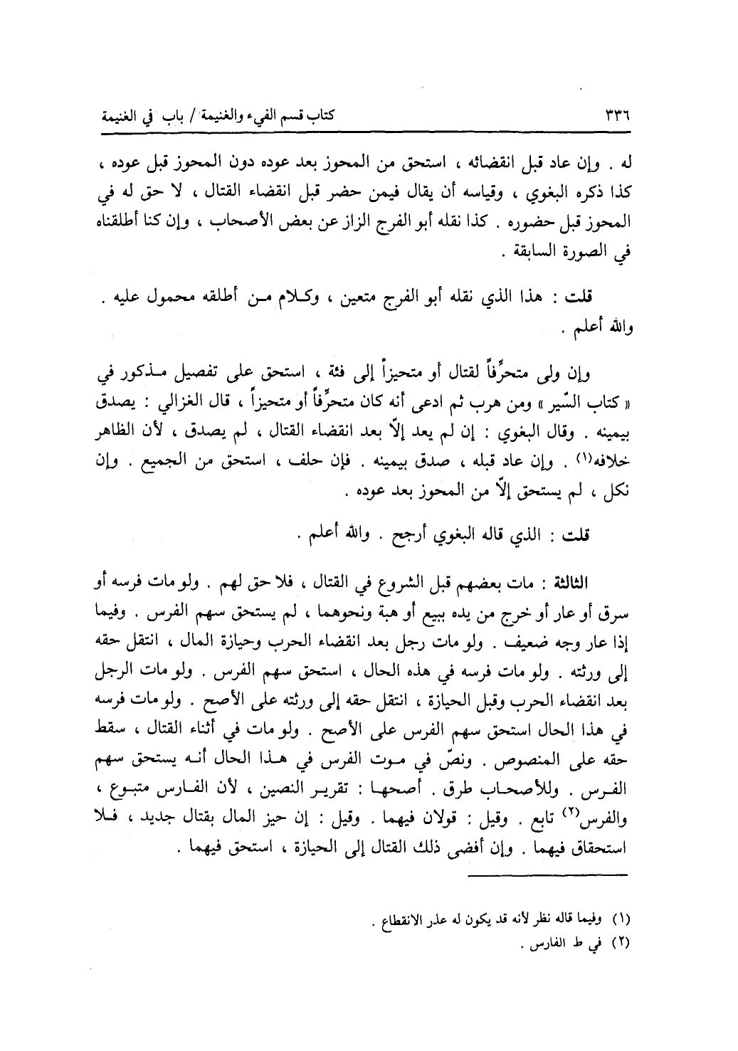 له. وإن عاد قبل انقضائه، استحق من المحوز بعد عوده دون المحوز قبل عوده، كذا ذكره البغوي، وقياسه أن يقال فيمن حضر قبل انقضاء القتال: لا حق له في المحوز قبل حضوره. كذا نقله أبو الفرج الزاز عن بعض الاصحاب، وإن كنا أطلقناه في الصورة السابقة. قلت: هذا الذي نقله أبو الفرج متعين، وكلام من أطلقه محمول عليه. والله أعلم. وإن ولى متحرفا لقتال أو متحيزا إلى فئة، استحق على تفصيل مذكور في كتاب السير ومن هرب ثم ادعى أنه كان متحرفا أو متحيزا، قال الغزالي: يصدق بيمينه. وقال البغوي: إن لم يعد إلا بعد انقضاء القتال، لم يصدق، لان الظاهر خلافه. وإن عاد قبله، صدق بيمينه. فإن حلف، استحق من الجميع. وإن نكل، لم يستحق إلا من المحوز بعد عوده. قلت: الذي قاله البغوي أرجح. والله أعلم. (الصورة) الثالثة: مات بعضهم قبل الشروع في القتال، فلا حقله. ولو مات فرسه أو سرق أو عار أو خرج من يده ببيع أو هبة ونحوهما، لم يستحق سهم الفرس. وفيما إذا عار وجه ضعيف. ولو مات رجل بعد انقضاء الحرب وحيازة المال، انتقل حقه إلى ورثته. ولو مات فرسه في هذه الحال، استحق سهم الفرس. ولو مات الرجل بعد انقضاء الحرب وقبل الحيازة، انتقل حقه إلى ورثته على الاصح. ولو مات فرسه في هذا الحال، استحق سهم الفرس على الاصح. ولو مات في أثناء القتال، سقط حقه على المنصوص. ونص في موت الفرس في هذا الحال أنه يستحق سهم الفرس. وللاصحاب طرق. أصحها: تقرير النصين، لان الفارس متبوع، والفارس تابع. وقيل: قولان فيهما. وقيل: إن حيز المال بقتال جديد، فلا استحقاق فيهما. وإن أفضى ذلك القتال إلى الحيازة، استحق فيهما.
