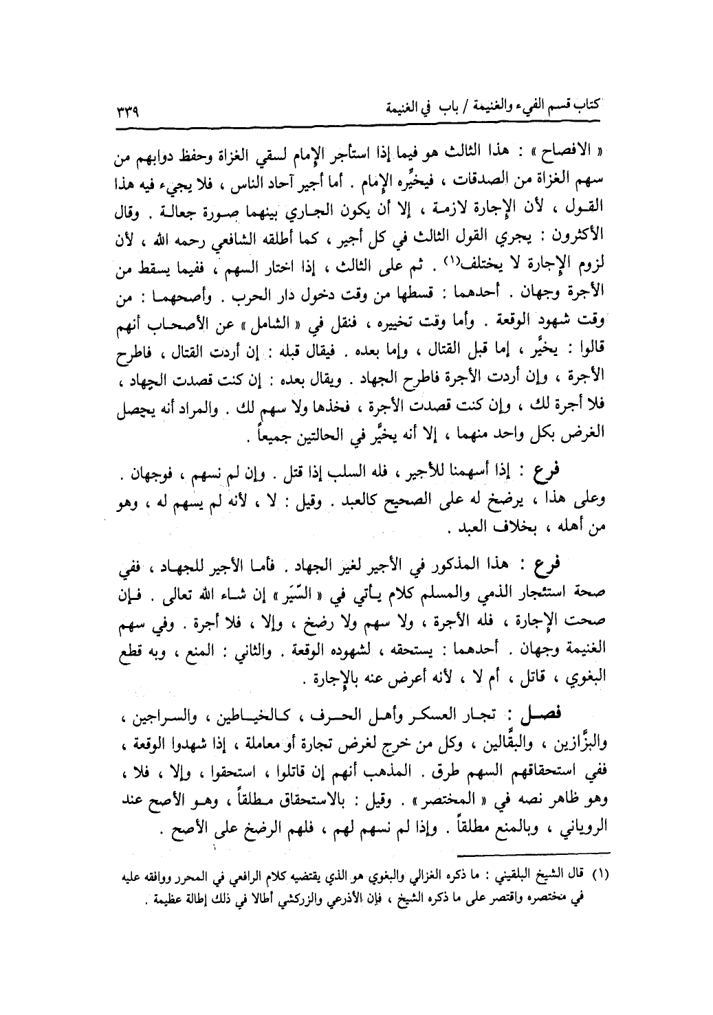 الافصاح: هذا الثالث هو فيما إذا استأجر الامام لسقي الغزاة وحفظ دوابهم من سهم الغزاة من الصدقات، فيخيره الامام إما أجير آحاد الناس، فلا يجئ فيه هذا القول، لان الاجارة لازمة، إلا أن يكون الجاري بينهما صورة جعالة. وقال الاكثرون: يجري القول الثالث في كل أجير، كما أطلقه الشافعي رحمه الله، لان لزوم الاجارة لا يختلف. ثم على الثالث، إذا اختار السهم، ففيما يسقط من الاجرة وجهان. أحدهما: قسطها من وقت دخول دار الحرب. وأصحهما: من وقت شهود الوقعة. وأما وقت تخييره، فنقل في الشامل عن الاصحاب أنهم قالوا: يخير، إما قبل القتال، وإما بعده. فيقال قبله: إن أردت القتال، فاطرح الاجرة، وإن أردت الاجرة فاطرح الجهاد. ويقال بعده: إن كنت قصدت الجهاد، فلا أجرة لك، وإن كنت قصدت الاجرة، فخذها ولا سهم لك. والمراد أنه يحصل الغرض بكل واحد منهما، إلا أنه يخير في الحالتين جميعا. فرع إذا أسهمنا للاجير، فله السلب إذا قتل. وإن لم نسهم، فوجهان. وعلى هذا، يرضخ له على الصحيح كالعبد. وقيل: لا، لانه لم يسهم له، وهو من أهله، بخلاف العبد. فرع هذا المذكور في الاجير لغير الجهاد. فأما الاجير للجهاد، ففي صحة استئجار الذمي والمسلم كلام يأتي في السير إن شاء الله تعالى. فإن صحت الاجارة، فله الاجرة، ولا سهم ولا رضخ، وإلا، فلا أجرة. وفي سهم الغنيمة وجهان. أحدهما: يستحقه، لشهوده الوقعة. والثاني: المنع، وبه قطع البغوي، قاتل، أم لا، لانه أعرض عنه بالاجارة. فصل تجار العسكر وأهل الحرف، كالخياطين، والسراجين، والبزازين، والبقالين، وكل من خرج لغرض تجارة أو معاملة، إذا شهدوا الوقعة، ففي استحقاقهم السهم طرق. المذهب أنهم إن قاتلوا، استحقوا، وإلا، فلا، وهو ظاهر نصه في المختصر. وقيل: بالاستحقاق مطلقا، وهو الاصح عند الروياني، وبالمنع مطلقا. وإذا لم نسهم لهم، فلهم الرضخ على الاصح.