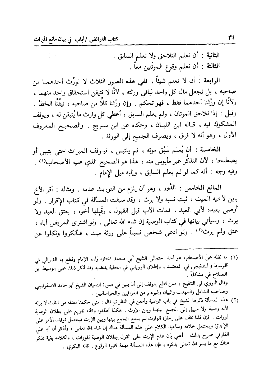 الثانية: أن نعلم التلاحق ولا نعلم السابق. الثالثة: أن نعلم وقوع الموتتين معا. الرابعة: أن لا نعلم شيئا، ففي هذه الصور الثلاث لا نورث أحدهما من صاحبه، بل نجعل مال كل واحد لباقي ورثته، لانا لا نتيقن استحقاق واحد منهما، ولانا إن ورثنا أحدهما فقط، فهو تحكم. وإن ورثنا كلا من صاحبه، تيقنا الخطأ. وقيل: إذا تلاحق الموتان، ولم يعلم السابق، أعطي كل وارث لهم ما يتيقن له، ويوقف المشكوك فيه، قاله ابن اللبان، وحكاه عن ابن سريج. والصحيح المعروف الاول، وهو أنه لا فرق، ويصرف الجميع إلى الورثة. الخامسة: أن يعلم سبق موته، ثم يلتبس، فيوقف الميراث حتى يتبين أو يصطلحا، لان التذكر غير مأيوس منه، هذا هو الصحيح الذي عليه الاصحاب. وفيه وجه: أنه كما لو لم يعلم السابق، وإليه ميل الامام. المانع الخامس: الدور، وهو أن يلزم من التوريث عدمه. ومثاله: أقر الاخ بابن لاخيه الميت، ثبت نسبه ولا يرث، وقد سبقت المسألة في كتاب الاقرار. ولو أوصى بعبده لابي العبد، فمات الاب قبل القبول، وقبلها أخوه، يعتق العبد ولا يرث، وسيأتي بيانها في كتاب الوصية إن شاء الله تعالى. ولو اشترى المريض أباه، عتق ولم يرث. ولو ادعى شخص نسبا على ورثه ميت، فأنكروا ونكلوا عن