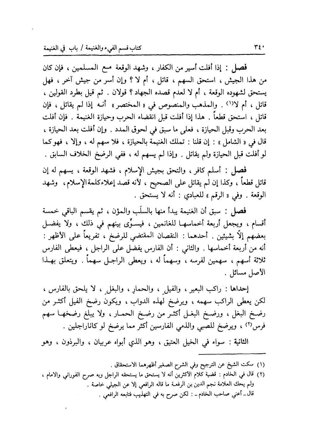 فصل إذا أفلت أسير من الكفار، وشهد الوقعة مع المسلمين، فإن كان من هذا الجيش، استحق السهم، قاتل، أم لا ؟ وإن أسر من جيش آخر، فهل يستحق لشهوده الوقعة، أم لا لعدم قصده الجهاد ؟ قولان. ثم قيل بطرد القولين، قاتل، أم لا. والمذهب والمنصوص في المختصر أنهما إذا لم يقاتل، فإن قاتل، استحق قطعا. هذا إذا أفلت قبل انقضاء الحرب وحيازة الغنيمة. فإن أفلت بعد الحرب وقبل الحيازة، فعلى ما سبق في لحوق المدد. وإن أفلت بعد الحيازة، قال في الشامل: إن قلنا: تملك الغنيمة بالحيازة، فلا سهم له، وإلا، فهو كما لو أفلت قبل الحيازة ولم يقاتل. وإذا لم يسهم له، ففي الرضخ الخلاف السابق. فصل أسلم كافر، والتحق بجيش الاسلام، فشهد الوقعة، يسهم له إن قاتل قطعا، وكذا إن لم يقاتل على الصحيح، لانه قصد إعلاء كلمة الاسلام، وشهد الوقعة. وفي الرقم للعبادي: أنه لا يستحق. فصل سبق أن الغنيمة يبدأ منها بالسلب والمؤن، ثم يقسم الباقي خمسة أقسام، ويجعل أربعة أخماسها للغانمين، فيسوى بينهم في ذلك، ولا يفضل بعضهم إلا بشيئين. أحدهما: النقصان المقتضي للرضخ، تفريعا على الاظهر: أنه من أربعة أخماسها. والثاني: أن الفارس يفضل على الراجل، فيعطى الفارس ثلاثة أسهم، سهمين لفرسه، وسهما له، ويعطى الراجل سهما. ويتعلق بهذا الاصل مسائل. إحداها: راكب البعير، والفيل، والحمار، والبغل، لا يلحق بالفارس، لكن يعطى الراكب سهمه، ويرضخ لهذه الدواب، ويكون رضخ الفيل أكثر من رضخ البغل، ورضخ البغل أكثر من رضخ الحمار، ولا يبلغ رضخها سهم فرس، ويرضخ (المسألة) الثانية: سواء للصبي والذمي الفارسين أكثر مما يرضخ لو كانا راجلين في الخيل العتيق، وهو الذي أبواه عربيان، والبرذون، وهو