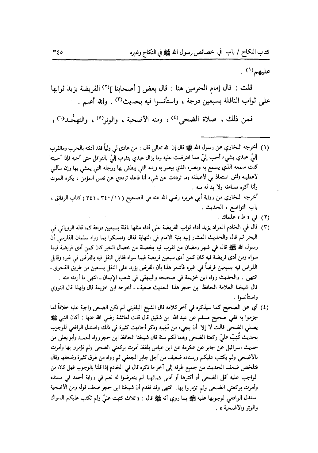 عليهم. قلت: قال إمام الحرمين هنا: قال بعض علمائنا: الفريضة يزيد ثوابها على ثواب النافلة بسبعين درجة، واستأنسوا فيه بحديث. والله أعلم. فمن ذلك، صلاة الضحى، ومنه الاضحية، والوتر، والتهجد،