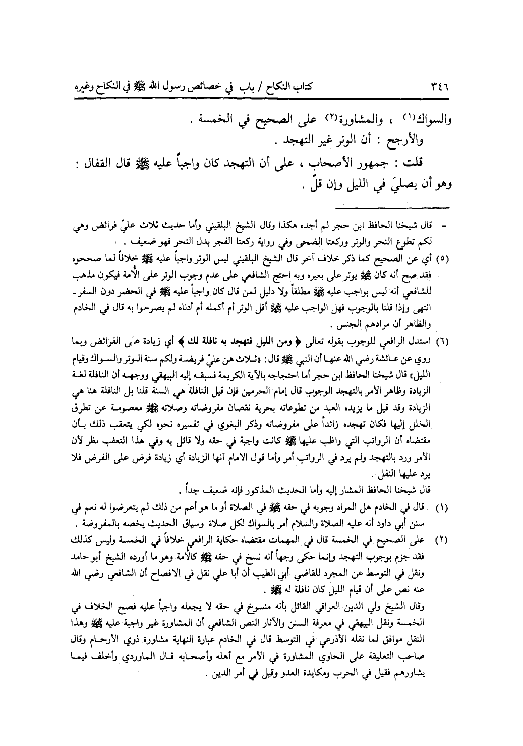 والسواك، والمشاورة على الصحيح في الخمسة. والارجح: أن الوتر غير التهجد. قلت: جمهور الاصحاب، على أن التهجد كان واجبا عليه - صلى الله عليه وسلم -. قال القفال: وهو أن يصلي في الليل وإن قل.
