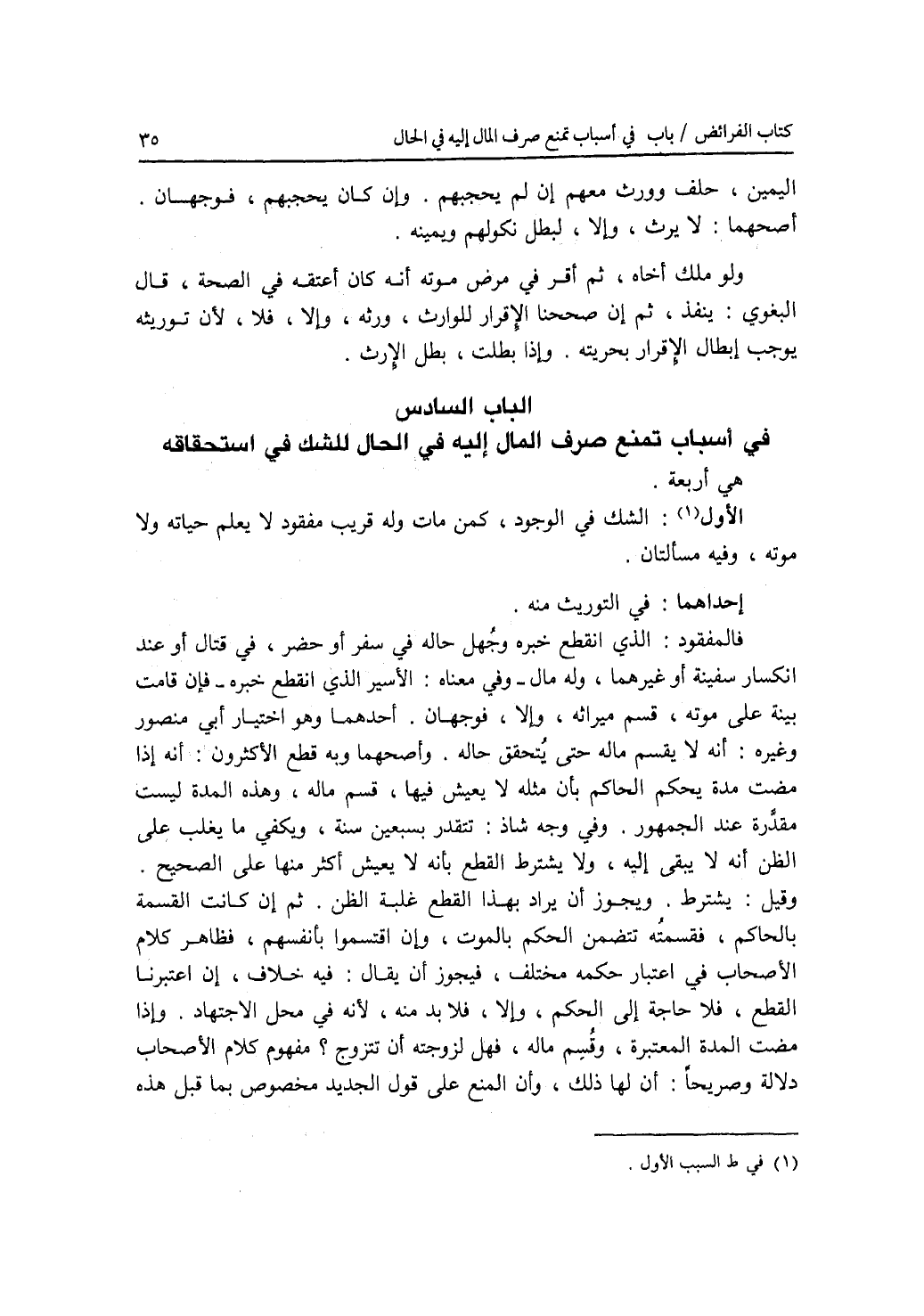 الباب السادس : في أسباب تمنع صرف المال إليه في الحال للشك في استحقاقه هي أربعة: السبب الاول: الشك في الوجود، كمن مات وله قريب مفقود لا يعلم حياته ولا موته، وفيه مسألتان. إحداهما: في التوريث منه. فالمفقود: الذي انقطع خبره وجهل حاله في سفر أو حضر، في قتال أو عند انكسار سفينة أو غيرهما، وله مال - وفي معناه: الاسير الذي انقطع خبره - فإن قامت بينة على موته، قسم ميراثه، وإلا، فوجهان. أحدهما وهو اختيار أبي منصور وغيره: أنه لا يقسم ماله حتى يتحقق حاله. وأصحهما وبه قطع الاكثرون: أنه إذا مضت مدة يحكم الحاكم بأن مثله لا يعيش فيها، قسم ماله، وهذه المدة ليست مقدرة عند الجمهور. وفي وجه شاذ: تتقدر بسبعين سنة، ويكفي ما يغلب على الظن أنه لا يبقى إليه، ولا يشترط القطع بأنه لا يعيش أكثر منها على الصحيح. وقيل: يشترط. ويجوز أن يراد بهذا القطع غلبة الظن. ثم إن كانت القسمة بالحاكم، فقسمته تتضمن الحكم بالموت، وإن اقتسموا بأنفسهم، فظاهر كلام الاصحاب في اعتبار حكمه مختلف، فيجوز أن يقال: فيه خلاف، إن اعتبرنا القطع، فلا حاجة إلى الحكم، وإلا، فلا بدمنه، لانه في محل الاجتهاد. وإذا مضت المدة المعتبرة، وقسم ماله، فهل لزوجته أن تتزوج ؟ ففهوم كلام الاصحاب دلالة وصريحا: أن لها ذلك، وأن المنع على قوله الجديد مخصوص بما قبل هذه