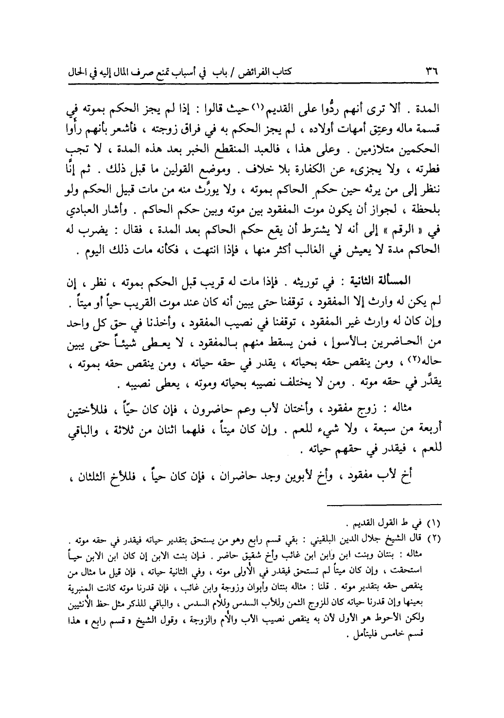 المدة. ألا ترى أنهم ردوا على القول القديم حيث قالوا: إذا لم يجز الحكم بموته في قسمة ماله وعتق أمهات أولاده، لم يجز الحكم به في فراق زوجته، فأشعر بأنهم رأوا الحكمين متلازمين. وعلى هذا، فالعبد المنقطع الخبر بعد هذه المدة، لا تجب فطرته، ولا يجزئ عن الكفارة بلا خلاف. وموضع القولين ما قبل ذلك. ثم إنا ننظر إلى من يرثه حين حكم الحاكم بموته، ولا يورث منه من مات قبيل الحكم ولو بلحظة، لجواز أن يكون موت المفقود بين موته وبين حكم الحاكم. وأشار العبادي في الرقم إلى أنه لا يشترط أن يقع حكم الحاكم بعد المدة، فقال: يضرب له الحاكم مدة لا يعيش في الغالب أكثر منها، فإذا انتهت، فكأنه مات ذلك اليوم. المسألة الثانية: في توريثه. فإذا مات له قريب قبل الحكم بموته، نظر، إن لم يكن له وارث إلا المفقود، توقفنا حتى يبين أنه كان عند موت القريب حيا أو ميتا. وإن كان له وارث غير المفقود، توقفنا في نصيب المفقود، وأخذنا في حق كل واحد من الحاضرين بالاسوإ، فمن يسقط منهم بالمفقود، لا يعطى شيئا حتى يبين حاله، ومن ينقص حقه بحياته، يقدر في حقه حياته، ومن ينقص حقه بموته، يقدر في حقه موته. ومن لا يختلف نصيبه بحياته وموته، يعطى نصيبه. مثاله: زوج مفقود، وأختان لاب وعم حاضرون، فان كان حيا، فللاختين أربعة من سبعة، ولا شئ للعم. وإن كان ميتا، فلهما إثنان من ثلاثة، والباقي للعم، فيقدر في حقهم حياته. أخ لاب مفقود، وأخ لابوين وجد حاضران، فإن كان حيا، فللاخ الثلثان،