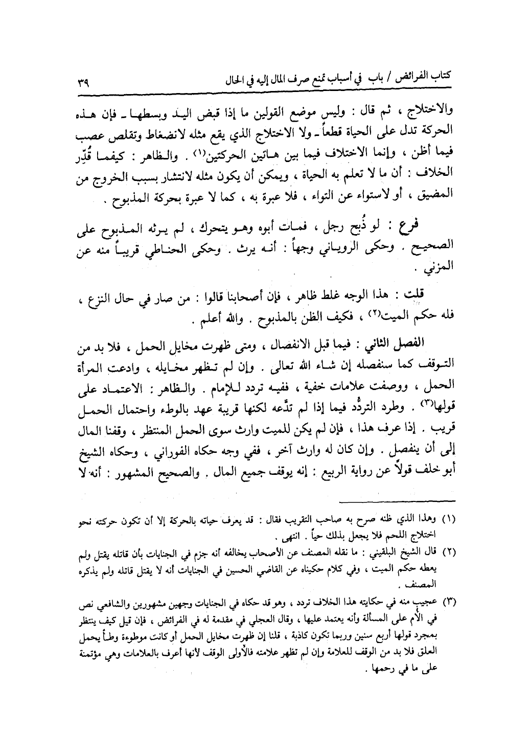 والاختلاج، ثم قال: وليس موضع القولين ما إذا قبض اليد وبسطها - فان هذه الحركة تدل على الحياة قطعا - ولا الاختلاج الذي يقع مثله لانضغاط وتقلص عصب فيما أظن، وإنما الاختلاف فيما بين هاتين الحركتين. والظاهر: كيفما قدر الخلاف: أن ما لا تعلم به الحياة، ويمكن أن يكون مثله لانتشار بسبب الخروج من المضيق أو لاستواء عن التواء، فلا عبرة به، كما لا عبرة بحركة المذبوح. فرع لو ذبح رجل، فمات أبوه وهو يتحرك، لم يرثه المذبوح على الصحيح. وحكى الروياني وجها: أنه يرث. وحكى الحناطي قريبا منه عن المزني. قلت: هذا الوجه غلط ظاهر، فان أصحابنا قالوا: من صار في حال النزع، فله حكم الميت، فكيف الظن بالمذبوح والله أعلم. الفصل الثاني: فيما قبل الانفصال، ومتى ظهرت مخايل الحمل، فلا بد من التوقف كما سنفصله إن شاء الله تعالى. وإن لم تظهر مخايله، وادعت المرأة الحمل، ووصفت علامات خفية، ففيه تردد للامام. والظاهر: الاعتماد على قولها. وطرد التردد فيما إذا لم تدعه لكنها قريبة عهد بالوطئ واحتمال الحمل قريب. إذا عرف هذا، فان لم يكن للميت وارث سوى الحمل المنتظر، وقفنا المال إلى أن ينفصل. وإن كان له وارث آخر، ففي وجه حكاه الفوراني، وحكاه الشيخ أبو خلف قولا عن رواية الربيع: أنه يوقف جميع المال. والصحيح المشهور: أنه لا