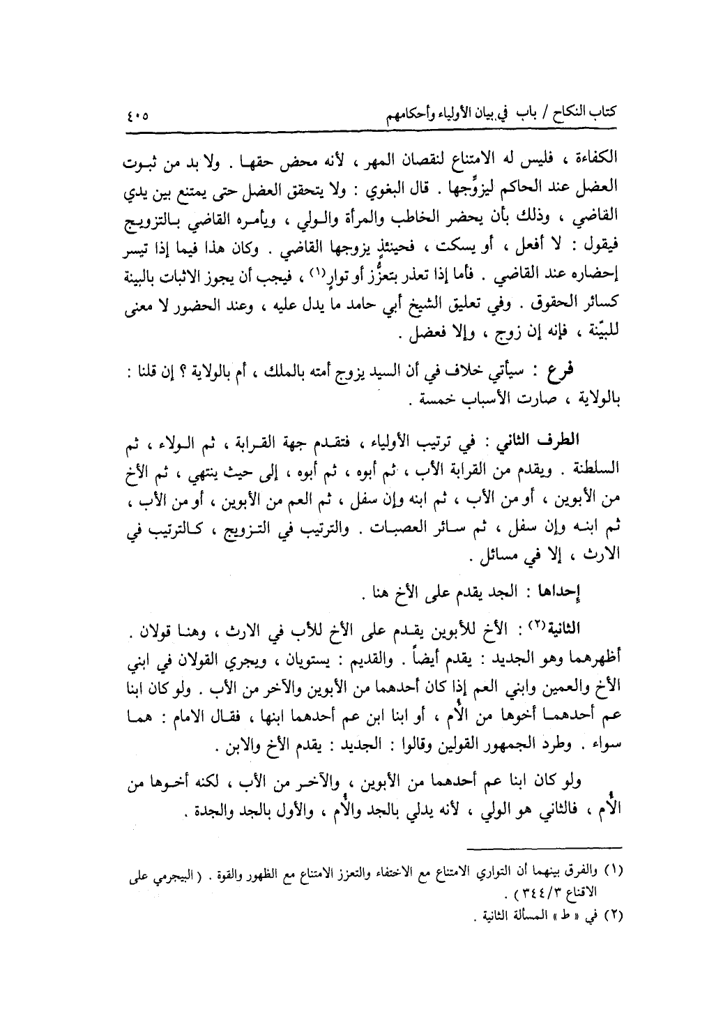 الكفاءة، فليس له الامتناع لنقصان المهر، لانه محض حقها. ولا بد من ثبوت العضل عند الحاكم ليزوجها. قال البغوي: ولا يتحقق العضل حتى يمتنع بين يدي القاضي، وذلك بأن يحضر الخاطب والمرأة والولي، ويأمره القاضي بالتزويج فيقول: لا أفعل، أو يسكت، فحينئذ يزوجها القاضي. وكان هذا فيما إذا تيسر إحضاره عند القاضي. فأما إذا تعذر بتعزز أو توار، فيجب أن يجوز الاثبات بالبينة كسائر الحقوق. وفي تعليق الشيخ أبي حامد ما يدل عليه، وعند الحضور لا معنى للبينة، فإنه إن زوج، وإلا فعضل. فرع سيأتي خلاف في أن السيد يزوج أمته بالملك، أم بالولاية ؟ إن قلنا: بالولاية، صارت الاسباب خمسة.
