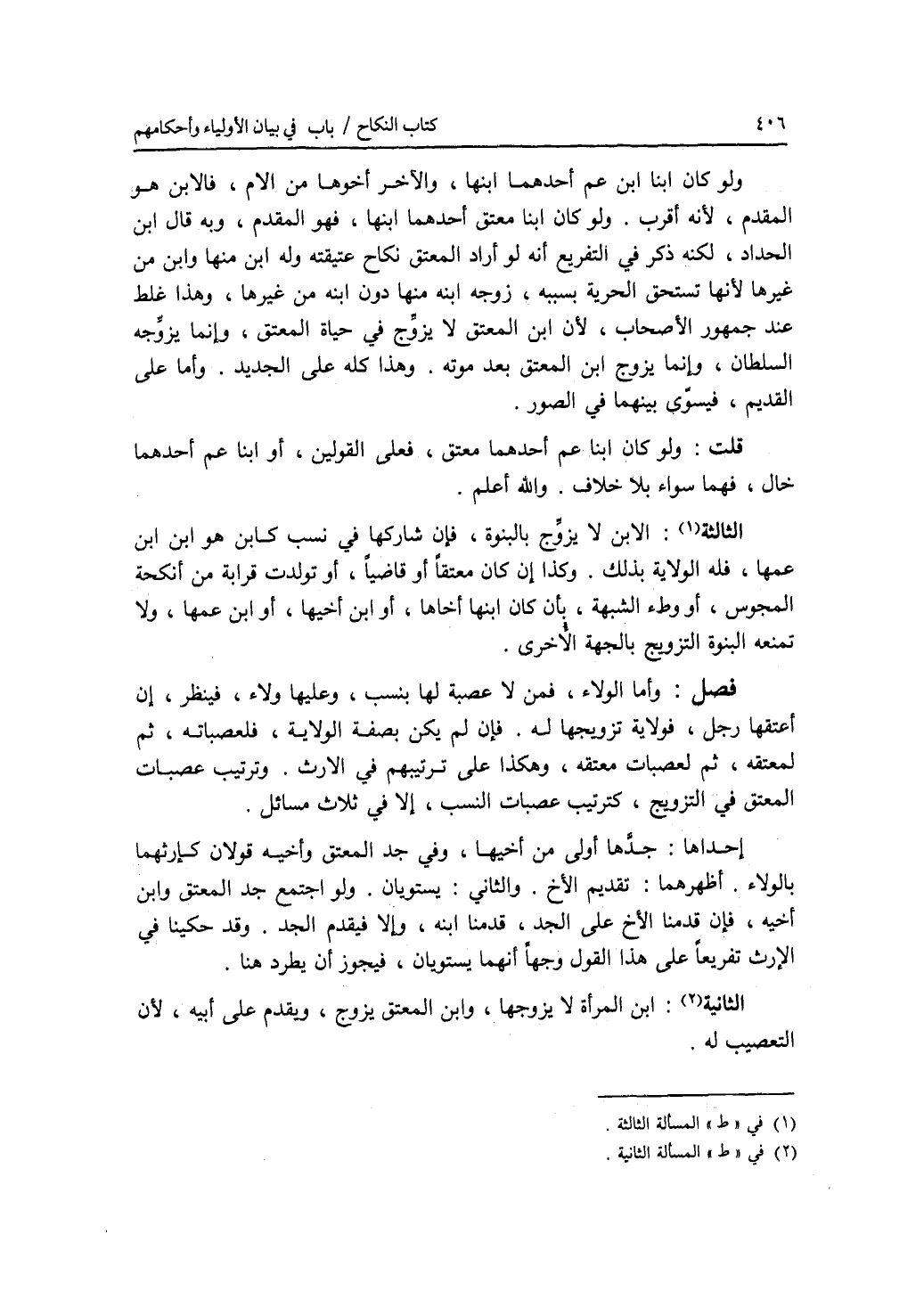 ولو كان ابنا ابن عم أحدهما ابنها، والآخر أخوها من الام، فالابن هو المقدم، لانه أقرب. ولو كان ابنا معتق أحدهما ابنها، فهو المقدم، وبه قال ابن الحداد، لكنه ذكر في التفريع أنه لو أراد المعتق نكاح عتيقته وله ابن منها وابن من غيرها لانها تستحق الحرية بسببه، زوجه ابنه منها دون ابنه من غيرها، وهذا غلط عند جمهور الاصحاب، لان ابن المعتق لا يزوج في حياة المعتق، وإنما يزوجه السلطان، وإنما يزوج ابن المعتق بعد موته. وهذا كله على الجديد. وأما على القديم، فيسوى بينهما في الصور. قلت: ولو كان ابنا عم أحدهما معتق، فعلى القولين، أو ابنا عم أحدهما خال، فهما سواء بلا خلاف. والله أعلم. (المسألة) الثالثة: الابن لا يزوج بالبنوة، فإن شاركها في نسب كابن هو ابن ابن عمها، فله الولاية بذلك. وكذا إن كان معتقا أو قاضيا، أو تولدت قرابة من أنكحة المجوس، أو وطئ الشبهة، بأن كان ابنها أخاها، أو ابن أخيها، أو ابن عمها، ولا تمنعه البنوة التزويج بالجهة الاخرى. فصل وأما الولاء، فمن لا عصبة لها بنسب، وعليها ولاء، فينظر، إن أعتقها رجل، فولاية تزويجها له. فإن لم يكن بصفة الولاية، فلعصباته، ثم لمعتقه، ثم لعصبات معتقه، وهكذا على ترتيبهم في الارث. وترتيب عصبات المعتق في التزويج، كترتيب عصبات النسب، إلا في ثلاث مسائل. إحداها: جدها أولى من أخيها، وفي جد المعتق وأخيه قولان كارثهما بالولاء. أظهرهما: تقديم الاخ. والثاني: يستويان. ولو اجتمع جد المعتق وابن أخيه، فإن قدمنا الاخ على الجد، قدمنا ابنه، وإلا فيقدم الجد. وقد حكينا في الارث تفريعا على هذا القول وجها أنهما يستويان، فيجوز أن يطرد هنا. (المسألة) الثانية: ابن المرأة لا يزوجها، وابن المعتق يزوج، ويقدم على أبيه، لان التعصيب له.