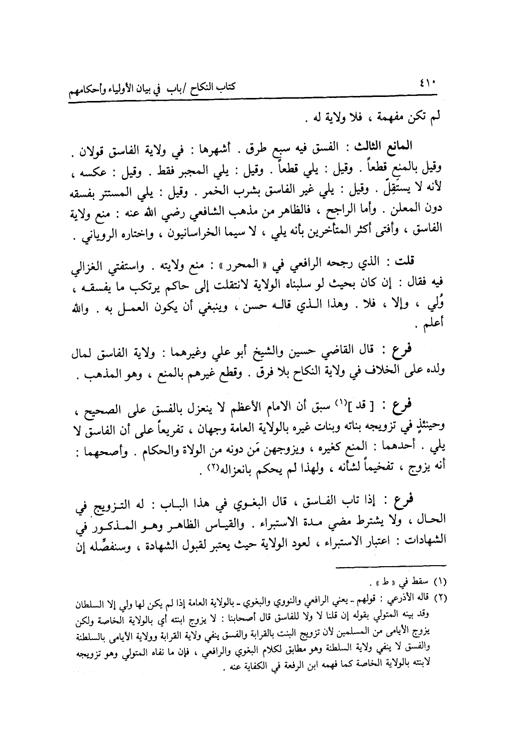 لم تكن مفهمة، فلا ولاية له. المانع الثالث: الفسق فيه سبع طرق. أشهرها: في ولاية الفاسق قولان، وقيل بالمنع قطعا. وقيل: يلي قطعا. وقيل: يلي المجبر فقط. وقيل: عكسه، لانه لا يستقل. وقيل: يلي غير الفاسق بشرب الخمر. وقيل: يلي المستتر بفسقه دون المعلن. وأما الراجح، فالظاهر من مذهب الشافعي رضي الله عنه: منع ولاية الفاسق، وأفتى أكثر المتأخرين بأنه يلي، لا سيما الخراسانيون، واختاره الروياني. قلت: الذي رجحه الرافعي في المحرر: منع ولايته. واستفتي الغزالي فيه فقال: إن كان بحيث لو سلبناه الولاية لانتقلت إلى حاكم يرتكب ما يفسقه، ولي، وإلا، فلا. وهذا الذي قاله حسن، وينبغي أن يكون العمل به. والله أعلم. فرع قال القاضي حسين والشيخ أبو علي وغيرهما: ولاية الفاسق لمال ولده على الخلاف في ولاية النكاح بلا فرق. وقطع غيرهم بالمنع، وهو المذهب. فرع سبق أن الامام الاعظم لا ينعزل بالفسق على الصحيح، وحينئذ في تزويجه بناته وبنات غيره بالولاية العامة وجهان، تفريعا على أن الفاسق لا يلي. أحدهما: المنع كغيره، ويزوجهن من دونه من الولاة والحكام. وأصحهما: أنه يزوج، تفخيما لشأنه، ولهذا لم يحكم بانعزاله. فرع إذا تاب الفاسق، قال البغوي في هذا الباب: له التزويج في الحال، ولا يشترط مضي مدة الاستبراء. والقياس الظاهر وهو المذكور في الشهادات: اعتبار الاستبراء، لعود الولاية حيث يعتبر لقبول الشهادة، وسنفصله إن