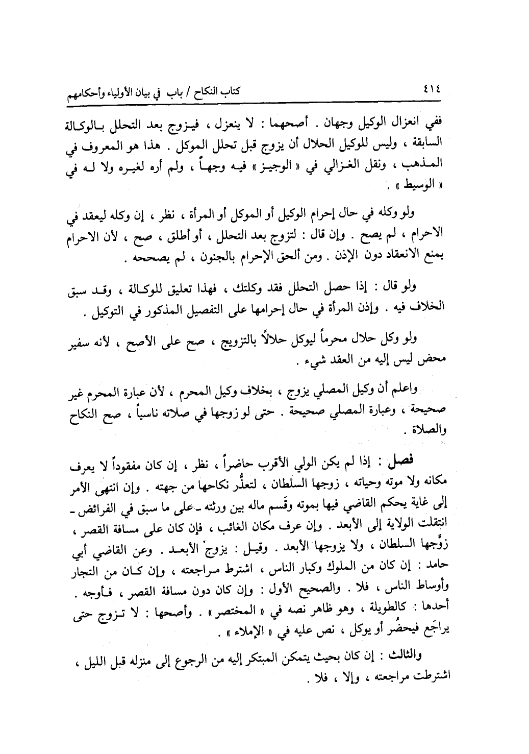 ففي انعزال الوكيل وجهان. أصحهما: لا ينعزل، فيزوج بعد التحلل بالوكالة السابقة، وليس للوكيل الحلال أن يزوج قبل تحلل الموكل. هذا هو المعروف في المذهب، ونقل الغزالي في الوجيز فيه وجها، ولم أره لغيره ولا له في الوسيط. ولو وكله في حال إحرام الوكيل أو الموكل أو المرأة، نظر، إن وكله ليعقد في الاحرام، لم يصح. وإن قال: لتزوج بعد التحلل، أو أطلق، صح، لان الاحرام يمنع الانعقاد دون الاذن. ومن ألحق الاحرام بالجنون، لم يصححه. ولو قال: إذا حصل التحلل فقد وكلتك، فهذا تعليق للوكالة، وقد سبق الخلاف فيه. وإذن المرأة في حال إحرامها على التفصيل المذكور في التوكيل. ولو وكل حلال محرما ليوكل حلالا بالتزويج، صح على الاصح، لانه سفير محض ليس إليه من العقد شئ. واعلم أن وكيل المصلي يزوج، بخلاف وكيل المحرم، لان عبارة المحرم غير صحيحة، وعبارة المصلي صحيحة. حتى لو زوجها في صلاته ناسيا، صح النكاح والصلاة. فصل إذا لم يكن الولي الاقرب حاضرا، نظر، إن كان مفقودا لا يعرف مكانه ولا موته وحياته، زوجها السلطان، لتعذر نكاحها من جهته. وإن انتهى الامر إلى غاية يحكم القاضي فيها بموته وقسم ماله بين ورثته - على ما سبق في الفرائض - انتقلت الولاية إلى الابعد. وإن عرف مكان الغائب، فإن كان على مسافة القصر، زوجها السلطان، ولا يزوجها الابعد. وقيل: يزوج الابعد. وعن القاضي أبي حامد: إن كان من الملوك وكبار الناس، اشترط مراجعته، وإن كان من التجار وأوساط الناس، فلا. والصحيح الاول. وإن كان دون مسافة القصر، فأوجه. أحدها: كالطويلة، وهو ظاهر نصه في المختصر. وأصحها: لا تزوج حتى يراجع فيحضر أو يوكل، نص عليه في الاملاء. والثالث: إن كان بحيث يتمكن المبتكر إليه من الرجوع إلى منزله قبل الليل، اشترطت مراجعته، وإلا، فلا.
