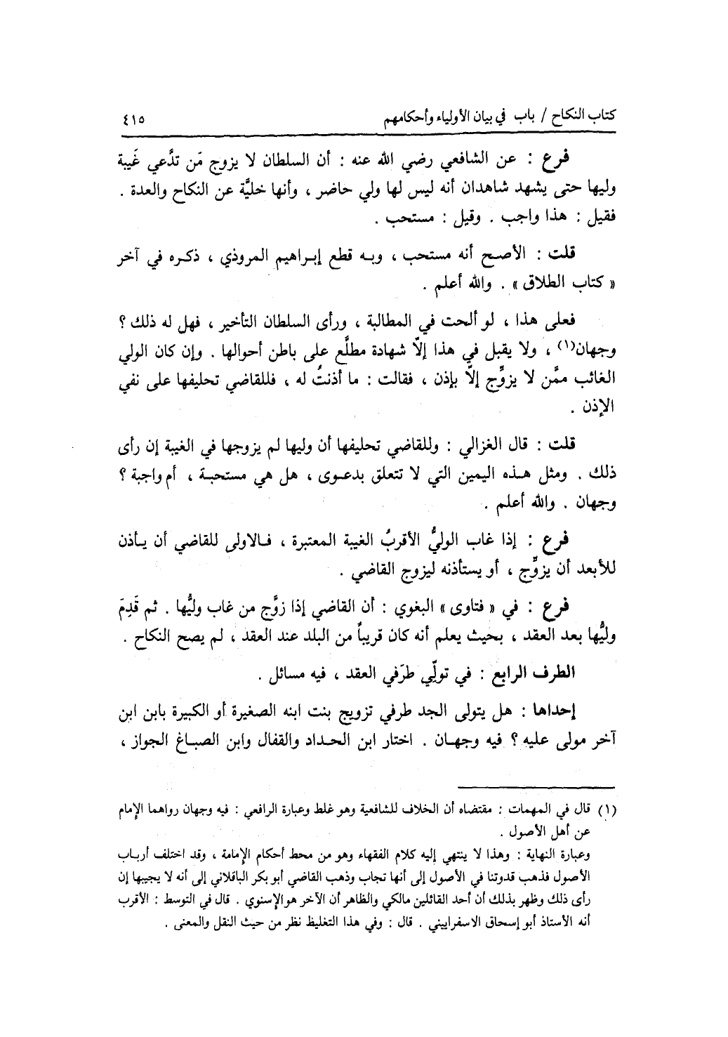 فرع عن الشافعي رضي الله عنه: أن السلطان لا يزوج من تدعي غيبة وليها حتى يشهد شاهدان أنه ليس لها ولي حاضر، وأنها خلية عن النكاح والعدة. فقيل: هذا واجب. وقيل: مستحب. قلت: الاصح أنه مستحب، وبه قطع إبرهيم المروذي، ذكره في آخر كتاب الطلاق. والله أعلم. فعلى هذا، لو ألحت في المطالبة، ورأى السلطان التأخير، فهل له ذلك ؟ وجهان، ولا يقبل في هذا إلا شهادة مطلع على باطن أحوالها. وإن كان الولي الغائب ممن لا يزوج إلا بإذن، فقالت: ما أذنت له، فللقاضي تحليفها على نفي الاذن. قلت: قال الغزالي: وللقاضي تحليفها أن وليها لم يزوجها في الغيبة إن رأى ذلك. ومثل هذه اليمين التي لا تتعلق بدعوى، هل هي مستحبة، أم واجبة ؟ وجهان. والله أعلم. فرع إذا غاب الولي الاقرب الغيبة المعتبرة، فالاولى للقاضي أن يأذن للابعد أن يزوج، أو يستأذن ليزوج القاضي. فرع في فتاوى البغوي: أن القاضي إذا زوج من غاب وليها، ثم قدم وليها بعد العقد، بحيث يعلم أنه كان قريبا من البلد عند العقد، لم يصح النكاح.