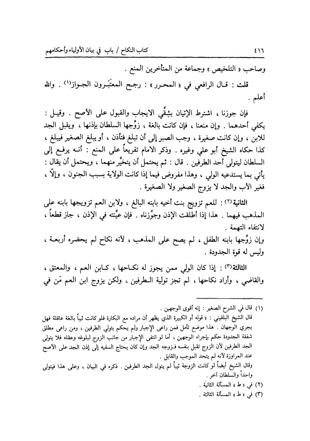 وصاحب التلخيص وجماعة من المتأخرين المنع. قلت: قال الرافعي في المحرر: رجح المعتبرون الجواز. والله أعلم. فإن جوزنا، اشترط الاتيان بشقي الايجاب والقبول على الاصح. وقيل: يكفي أحدهما. وإن منعنا، فإن كانت بالغة، زوجها السلطان بإذنها، ويقبل الجد للابن. وإن كانت صغيرة، وجب الصبر إلى أن تبلغ فتأذن، أو يبلغ الصغير فيقبل، كذا حكاه الشيخ أبو علي وغيره. وذكر الامام تفريعا على المنع: أنه يرفع إلى السلطان ليتولى أحد الطرفين. قال: ثم يحتمل أن يتخير منهما، ويحتمل أن يقال: يأتي بما يستدعيه الولي، وهذا مفروض فيما إذا كانت الولاية بسبب الجنون، وإلا، فغير الاب والجد لا يزوج الصغير ولا الصغيرة. المسألة الثانية: للعم تزويج بنت أخيه بابنه البالغ، ولابن العم تزويجها بابنه على المذهب فيهما. هذا إذا أطلقت الاذن وجوزناه. فإن عينته في الاذن، جاز قطعا، لانتفاء التهمة. وإن زوجها بابنه الطفل، لم يصح على المذهب، لانه نكاح لم يحضره أربعة، وليس له قوة الجدودة. المسألة الثالثة: إذا كان الولي ممن يجوز له نكاحها، كابن العم، والمعتق، والقاضي، وأراد نكاحها، لم تجز تولية الطرفين، ولكن يزوج ابن العم من في