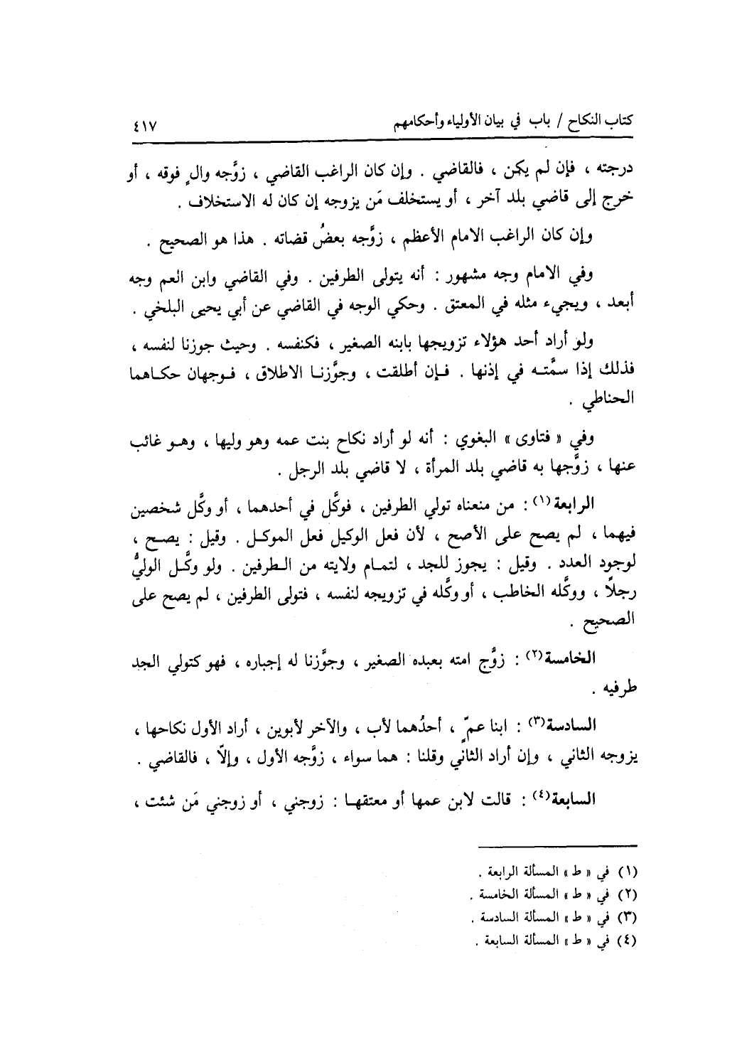 درجته، فإن لم يكن، فالقاضي. وإن كان الراغب القاضي، زوجه وال فوقه، أو خرج إلى قاضي بلد آخر، أو يستخلف من يزوجه إن كان له الاستخلاف. وإن كان الراغب الامام الاعظم، زوجه بعض قضاته. هذا هو الصحيح. وفي الامام وجه مشهور: أنه يتولى الطرفين. وفي القاضي وابن العم وجه أبعد، ويجئ مثله في المعتق. وحكي الوجه في القاضي عن أبي يحيى البلخي. ولو أراد أحد هؤلاء تزويجها بابنه الصغير، فكنفسه. وحيث جوزنا لنفسه، فذلك إذا سمته في إذنها. فإن أطلقت، وجوزنا الاطلاق، فوجهان حكاهما الحناطي. وفي فتاوى البغوي: أنه لو أراد نكاح بنت عمه وهو وليها، وهو غائب عنها، زوجها به قاضي بلد المرأة، لا قاضي بلد الرجل. المسألة الرابعة: من منعناه تولي الطرفين، فوكل في أحدهما، أو وكل شخصين فيهما، لم يصح على الاصح، لان فعل الوكيل فعل الموكل. وقيل: يصح، لوجود العدد. وقيل: يجوز للجد، لتمام ولايته من الطرفين. ولو وكل الولي رجلا، ووكله الخاطب، أو وكله في تزويجه لنفسه، فتولى الطرفين، لم يصح على الصحيح. المسألة الخامسة: زوج أمته بعبده الصغير، وجوزنا له إجباره، فهو كتولي الجد طرفيه. المسألة السادسة: ابنا عم، أحدهما لاب، والآخر لابوين، أراد الاول نكاحها، يزوجه الثاني، وإن أراد الثاني وقلنا: هما سواء، زوجه الاول، وإلا، فالقاضي. المسألة السابعة: قالت لابن عمها أو معتقها: زوجني، أو زوجني من شئت،
