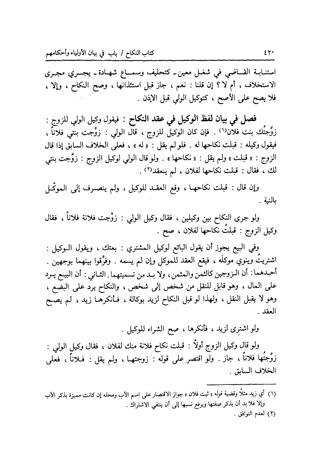 استنابة القاضي في شغل معين - كتحليف وسماع شهادة - يجري مجرى الاستخلاف، أم لا ؟ إن قلنا: نعم، جاز قبل استئذانها، وصح النكاح، وإلا، فلا يصح على الاصح، كتوكيل الولي قبل الاذن. فصل في بيان لفظ الوكيل في عقد النكاح فيقول وكيل الولي للزوج: زوجتك بنت فلان. فإن كان الوكيل للزوج، قال الولي: زوجت بنتي فلانا، فيقول وكيله: قبلت نكاحها له. فلو لم يقل: له، فعلى الخلاف السابق إذا قال الزوج: قبلت ولم يقل: نكاحها. ولو قال الولي لوكيل الزوج: زوجت بنتي لك، فقال: قبلت نكاحها لفلان، لم ينعقد. وإن قال: قبلت نكاحها، وقع العقد للوكيل، ولم ينصرف إلى الموكل بالنية. ولو جرى النكاح بين وكيلين، فقال وكيل الولي: زوجت فلانة فلانا، فقال وكيل الزوج: قبلت نكاحها لفلان، صح. وفي البيع يجوز أن يقول البائع لوكيل المشتري: بعتك، ويقول الوكيل: إشتريت وينوي موكله، فيقع العقد للموكل وإن لم يسمه. وفرقوا بينهما بوجهين. أحدهما: أن الزوجين كالثمن والمثمن، ولا بد من تسميتهما. الثاني: أن البيع يرد على المال، وهو قابل للنقل من شخص إلى شخص، والنكاح يرد على البضع، وهو لا يقبل النقل، ولهذا لو قبل النكاح لزيد بوكالة، فأنكرها زيد، لم يصح العقد. ولو اشترى لزيد، فأنكرها، صح الشراء للوكيل. ولو قال وكيل الزوج أولا: قبلت نكاح فلانة منك لفلان، فقال وكيل الولي: زوجتها فلانا، جاز. ولو اقتصر على قوله: زوجتها، ولم يقل: فلانا، فعلى الخلاف السابق.