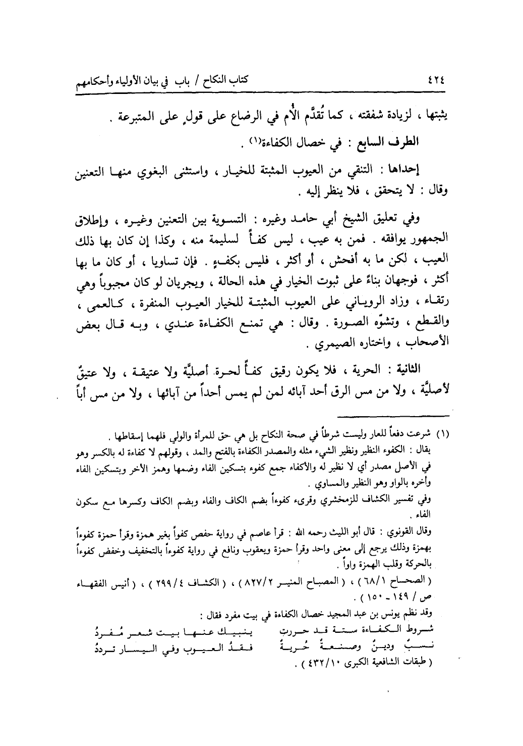 الطرف السابع : في خصال الكفاءة. إحداها: التنقي من العيوب المثبتة للخيار، واستثنى البغوي منها التعنين وقال: لا يتحقق، فلا ينظر إليه. وفي تعليق الشيخ أبي حامد وغيره: التسوية بين التعنين وغيره، وإطلاق الجمهور يوافقه. فمن به عيب، ليس كف ءا لسليمة منه، وكذا إن كان بها ذلك (العيب)، لكن ما به أفحش، أو أكثر، فليس بكف ء. فإن تساويا، أو كان ما بها أكثر، فوجهان بناء على ثبوت الخيار في هذه الحالة، ويجريان لو كان مجبوبا وهي رتقاء، وزاد الروياني على العيوب المثبتة للخيار العيوب المنفرة، كالعمى، والقطع، وتشوه الصورة. وقال: هي تمنع الكفاءة عندي، وبه قال بعض الاصحاب، واختاره الصيمري. الثانية: الحرية، فلا يكون رقيق كفئا لحرة أصلية ولا عتيقة، ولا عتيق لاصلية، ولا من مس الرق أحد آبائه لمن لم يمس أحدا من آبائها، ولا من مس أبا