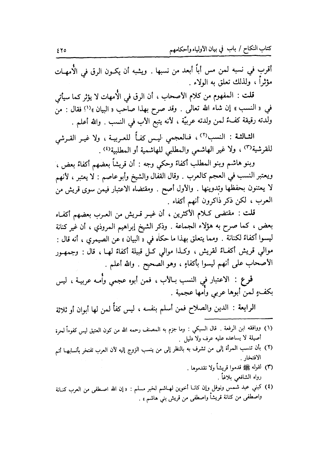 أقرب في نسبه لمن مس أبا أبعد من نسبها. ويشبه أن يكون الرق في الامهات مؤثرا، ولذلك تعلق به الولاء. قلت: المفهوم من كلام الاصحاب، أن الرق في الامهات لا يؤثر كما سيأتي في النسب إن شاء الله تعالى. وقد صرح بهذا صاحب البيان فقال: من ولدته رقيقة كف ء لمن ولدته عربية، لانه يتبع الاب في النسب. والله أعلم. الثالثة: النسب، فالعجمي ليس كف ءا للعربية، ولا غير القرشي للقرشية، ولا غير الهاشمي والمطلبي للهاشمية أو المطلبية. وبنو هاشم وبنو المطلب أكفاء. وحكي وجه: أن قريشا بعضهم أكفاء بعض، ويعتبر النسب في العجم كالعرب. وقال القفال والشيخ أبو عاصم: لا يعتبر، لانهم لا يعتنون بحفظها وتدوينها. والاول أصح. ومقتضاه الاعتبار فيمن سوى قريش من العرب أيضا، لكن ذكر ذاكرون أنهم أكفاء. قلت: مقتضى كلام الاكثرين، أن غير قريش من العرب بعضهم أكفاء بعض، كما صرح به هؤلاء الجماعة. وذكر الشيخ إبرهيم المروذي، أن غير كنانة ليسوا أكفاء لكنانة. ومما يتعلق بهذا ما حكاه في البيان عن الصيمري، أنه قال: موالي قريش أكفاء لقريش، وكذا موالي كل قبيلة أكفاء لها، (قال): وجمهور الاصحاب على أنهم ليسوا بأكفاء، وهو الصحيح. والله أعلم. فرع الاعتبار في النسب بالاب، فمن أبوه عجمي وأمه عربية، ليس بكف ء لمن أبوها عربي وأمها عجمية. الرابعة: الدين والصلاح، فمن أسلم بنفسه، ليس كف ءا لمن لها أبوان أو ثلاثة