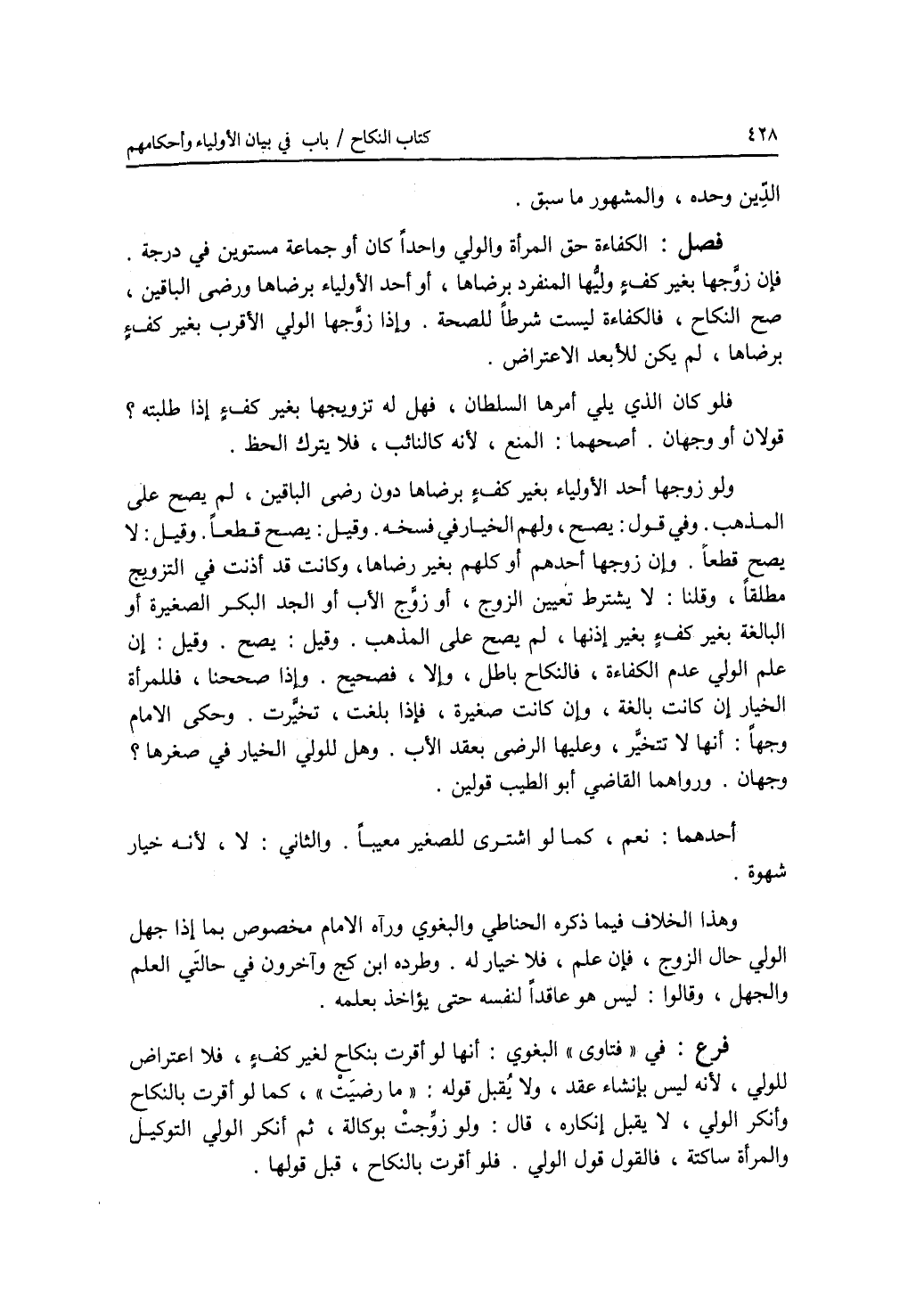 الدين وحده، والمشهور ما سبق. فصل الكفاءة حق المرأة والولي واحدا كان أو جماعة مستوين في درجة. فإن زوجها بغير كف ء وليها المنفرد برضاها، أو أحد الاولياء برضاها ورضى الباقين، صح النكاح، فالكفاءة ليست شرطا للصحة. وإذا زوجها الولي الاقرب بغير كف ء برضاها، لم يكن للابعد الاعتراض. فلو كان الذي يلي أمرها السلطان، فهل له تزويجها بغير كف ء إذا طلبته ؟ قولان أو وجهان. أصحهما: المنع، لانه كالنائب، فلا يترك الحظ. ولو زوجها أحد الاولياء بغير كف ء برضاها دون رضى الباقين، لم يصح على المذهب. وفي قول: يصح، ولهم الخيار في فسخه. وقيل: يصح قطعا. وقيل: لا يصح قطعا. وإن زوجها أحدهم أو كلهم بغير رضاها، وكانت قد أذنت في التزويج مطلقا، وقلنا: لا يشترط تعيين الزوج، أو زوج الاب أو الجد البكر الصغيرة أو البالغة بغير كف ء بغير إذنها، لم يصح على المذهب. وقيل: يصح. وقيل: إن علم الولي عدم الكفاءة، فالنكاح باطل، وإلا، فصحيح. وإذا صححنا، فللمرأة الخيار إن كانت بالغة، وإن كانت صغيرة، فإذا بلغت، تخيرت. وحكى الامام وجها: أنها لا تتخير، وعليها الرضى بعقد الاب. وهل للولي الخيار في صغرها ؟ وجهان. ورواهما القاضي أبو الطيب قولين. أحدهما: نعم، كما لو اشترى للصغير معيبا. والثاني: لا، لانه خيار شهوة. وهذا الخلاف فيما ذكره الحناطي والبغوي ورآه الامام مخصوص بما إذا جهل الولي حال الزوج، فإن علم، فلا خيار له. وطرده ابن كج وآخرون في حالتي العلم والجهل، وقالوا: ليس هو عاقدا لنفسه حتى يؤاخذ بعلمه. فرع في فتاوى البغوي: أنها لو أقرت بنكاح لغير كف ء، فلا اعتراض للولي، لانه ليس بإنشاء عقد، ولا يقبل قوله: ما رضيت، كما لو أقرت بالنكاح وأنكر الولي، لا يقبل إنكاره، قال: ولو زوجت بوكالة، ثم أنكر الولي التوكيل والمرأة ساكتة، فالقول قول الولي. فلو أقرت بالنكاح، قبل قولها.