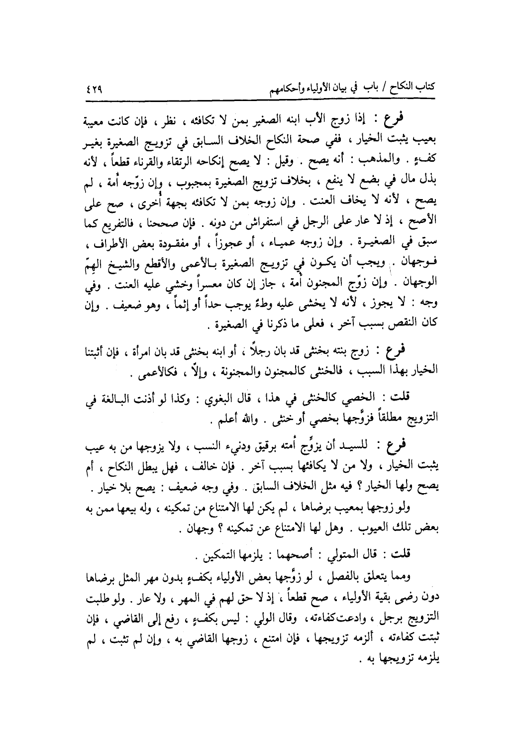 فرع إذا زوج الاب ابنه الصغير بمن لا تكافئه، نظر، فإن كانت معيبة بعيب يثبت الخيار، ففي صحة النكاح الخلاف السابق في تزويج الصغيرة بغير كف ء. والمذهب: أنه يصح. وقيل: لا يصح إنكاحه الرتقاء والقرناء قطعا، لانه بذل مال في بضع لا ينفع، بخلا ف تزويج الصغيرة بمجبوب. وإن زوجه أمة، لم يصح، لانه لا يخاف العنت. وإن زوجه بمن لا تكافئه بجهة أخرى، صح على الاصح، إذ لا عار على الرجل في استفراش من دونه. فإن صححنا، فالتفريع كما سبق في الصغيرة. وإن زوجه عمياء، أو عجوزا، أو مفقودة بعض الاطراف، فوجهان. ويجب أن يكون في تزويج الصغيرة بالاعمى والاقطع والشيخ الهم الوجهان. وإن زوج المجنون أمة، جاز إن كان معسرا وخشي عليه العنت. وفي وجه: لا يجوز، لانه لا يخشى عليه وطئ يوجب حدا أو إثما، وهو ضعيف. وإن كان النقص بسبب آخر، فعلى ما ذكرنا في الصغيرة. فرع زوج بنته بخنثى قد بان رجلا، أو ابنه بخنثى قد بان إمرأة، فإن أثبتنا الخيار بهذا السبب، فالخنثى كالمجنون والمجنونة، وإلا، فكالاعمى. قلت: الخصي كالخنثى في هذا، قال البغوي: وكذا لو أذنت البالغة في التزويج مطلقا فزوجها بخصي أو خنثى. والله أعلم. فرع للسيد أن يزوج أمته برقيق ودنئ النسب، ولا يزوجها من به عيب يثبت الخيار، ولا من لا يكافئها بسبب آخر. فإن خالف، فهل يبطل النكاح، أم يصح ولها الخيار ؟ فيه مثل الخلاف السابق. وفي وجه ضعيف: يصح بلا خيار. ولو زوجها بمعيب برضاها، لم يكن لها الامتناع من تمكينه، وله بيعها ممن به بعض تلك العيوب. وهل لها الامتناع من تمكينه ؟ وجهان. قلت: قال المتولي: أصحهما: يلزمها التمكين. ومما يتعلق بالفصل، لو زوجها بعض الاولياء بكف ء بدون مهر المثل برضاها دون رضى بقية الاولياء، صح قطعا، إذ لا حق لهم في المهر، ولا عار. ولو طلبت التزويج برجل، وادعت كفاءته، وقال الولي: ليس بكف ء، رفع إلى القاضي، فإن ثبتت كفاءته، ألزمه تزويجها، فإن امتنع، زوجها القاضي به، وإن لم